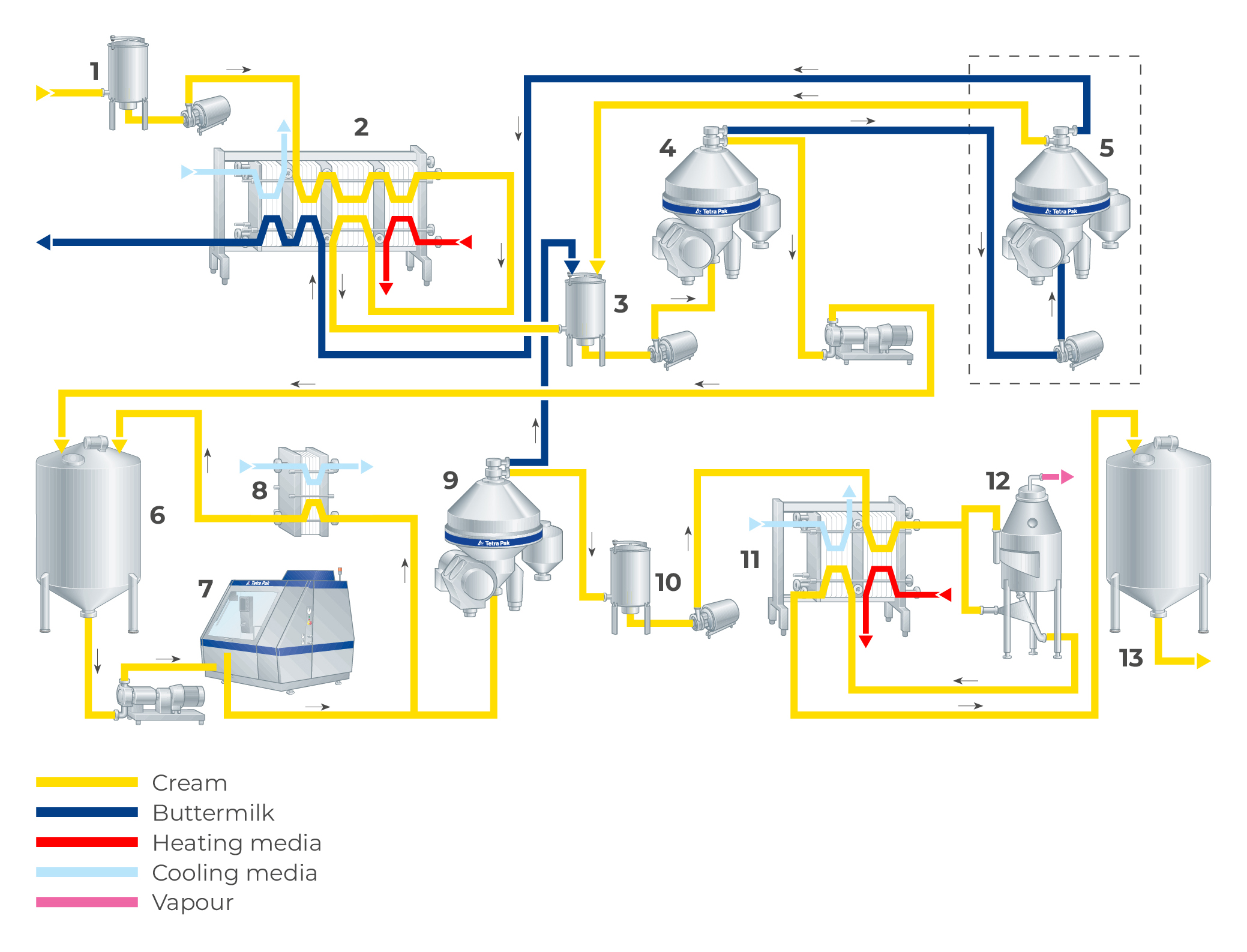 The heavy phase can be pumped into a tank for buttermilk or into a waste-collecting tank, depending on whether it is “pure” or contaminated with a neutraliser.