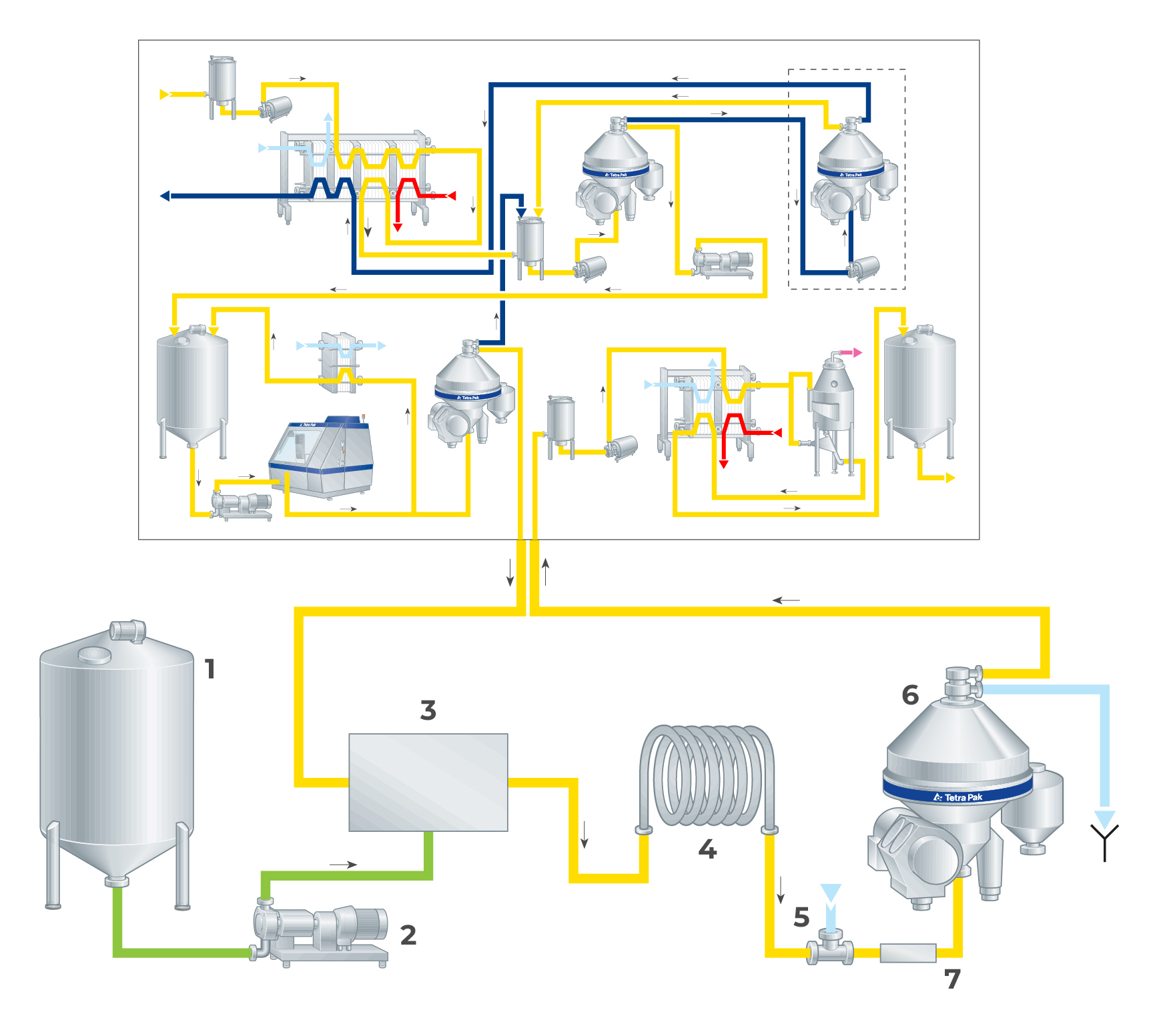 From the holding tank, the product is pumped to the final concentrator (3), after which the light phase, containing 99.5% fat, proceeds to a plate heat exchanger (5) for heating to 90 – 95 °C. From there, it proceeds to a vacuum vessel (6) and finally back to the plate heat exchanger (5) for cooling to the packing temperature of approximately 40 °C.
