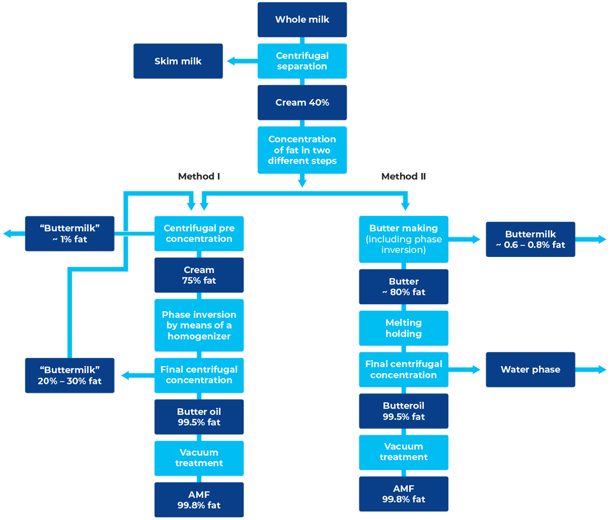 The key components of an AMF plant using cream are thus separators for the concentration of fat and homogenisers for phase inversion.