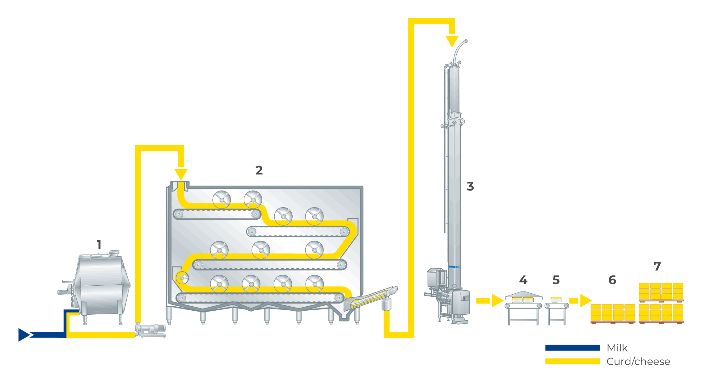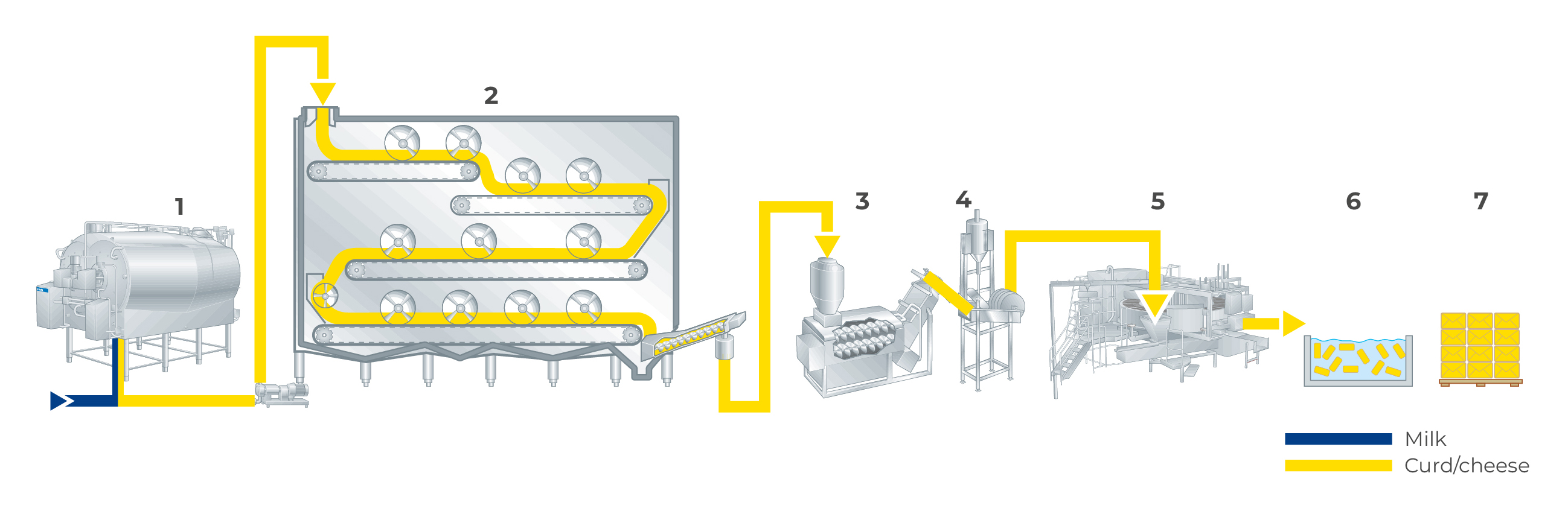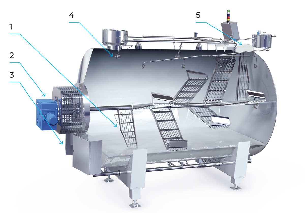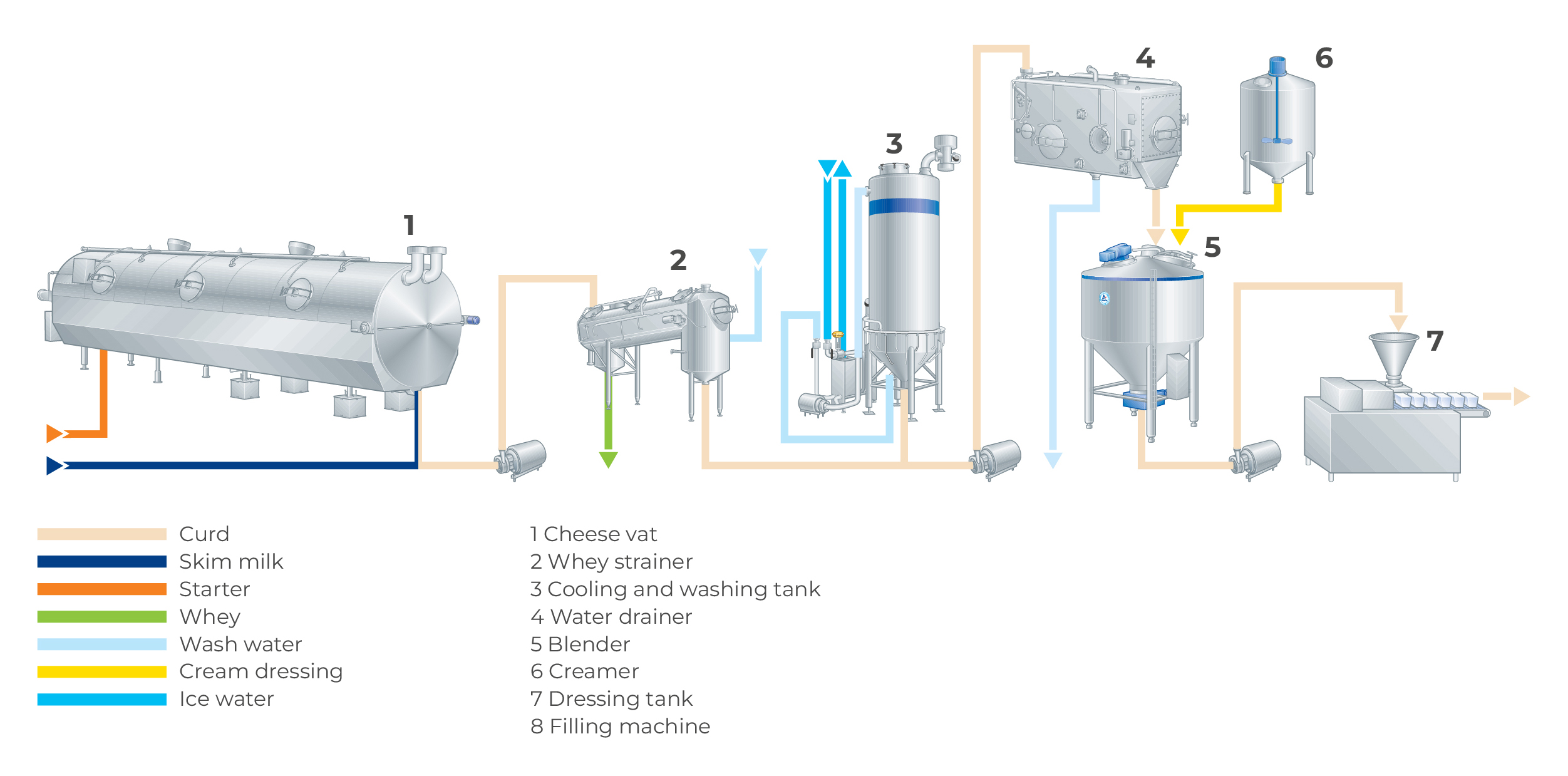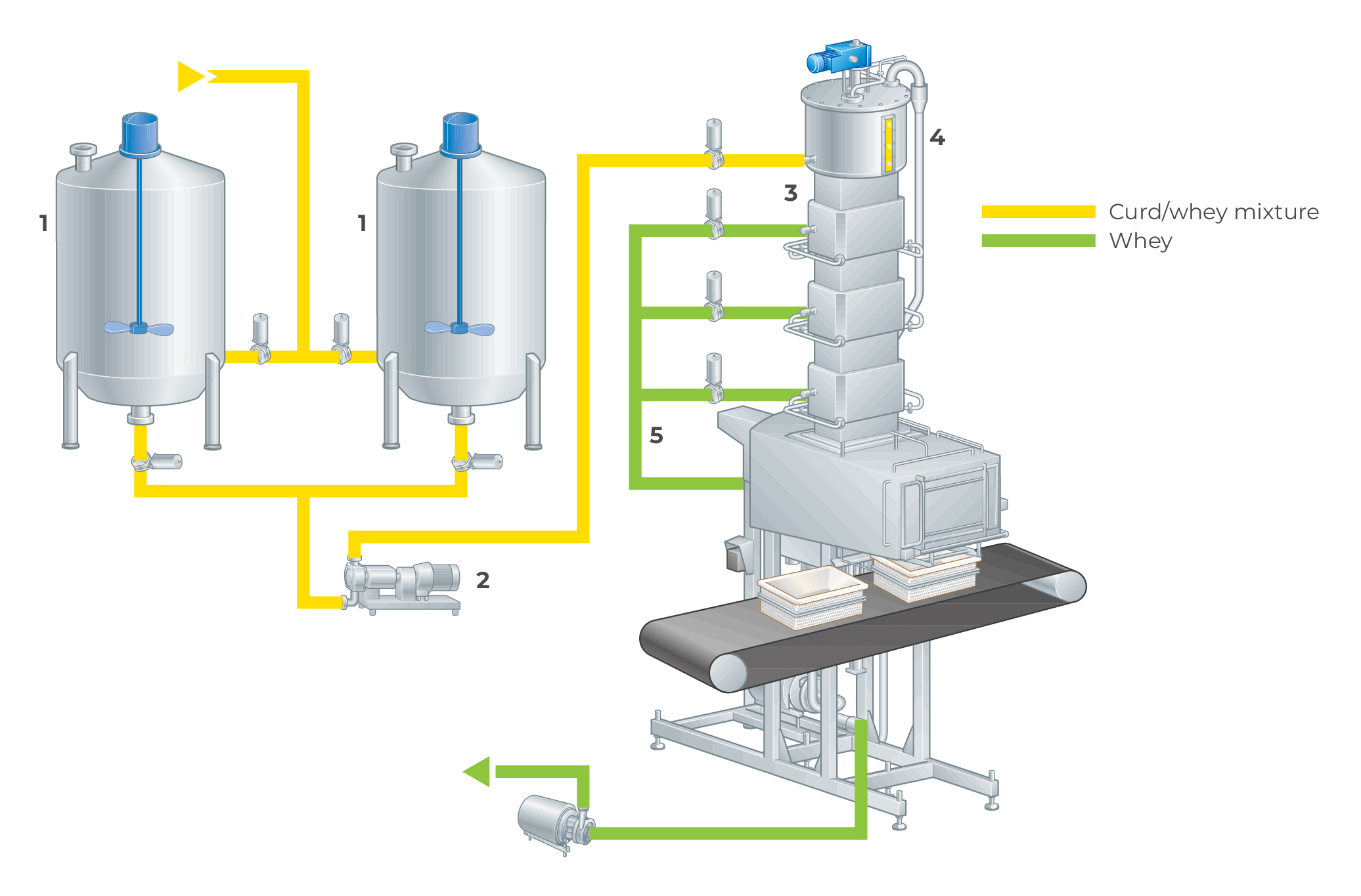 - Heating, scalding, directly (by wash water) or indirectly (via heating jacket), depending on type of cheese and dairy preference