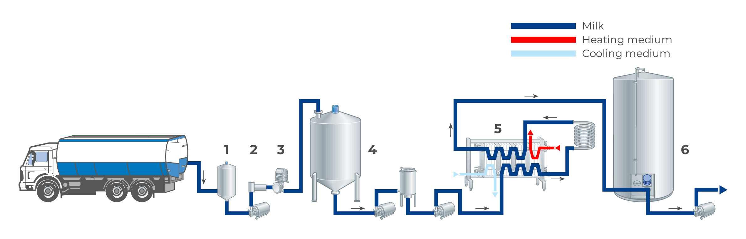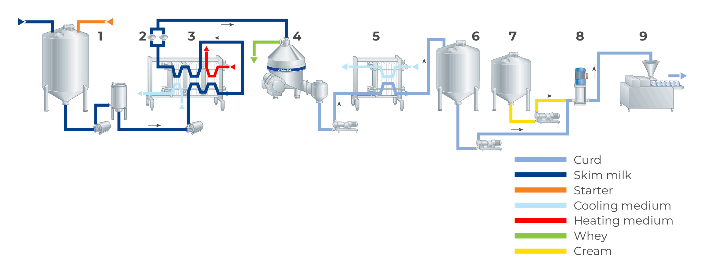 After pasteurization and cooling to fermentation temperature (20 – 30 °C depending on choice of starter culture), the milk is routed into a tank (1). A bacteria culture, typically containing Lactobacillus lactis/cremoris bacteria, is also added, often together with a small amount of rennet, normally one-tenth of what is used in ordinary cheese production or about 1 ml liquid rennet per 100 kg milk. This is done to obtain a firmer coagulum which improves separability.