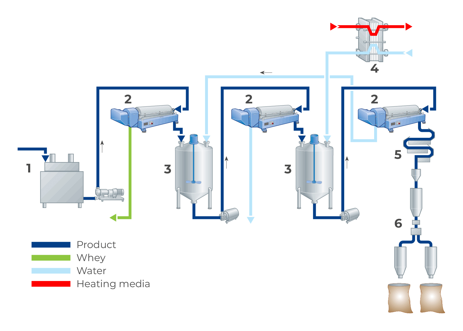 Therefore, in these circumstances, it is of interest to be able to plan continuous production lines, e.g. incorporating centrifugal machines for dewatering the casein and recovery of casein losses from the whey and wash water.