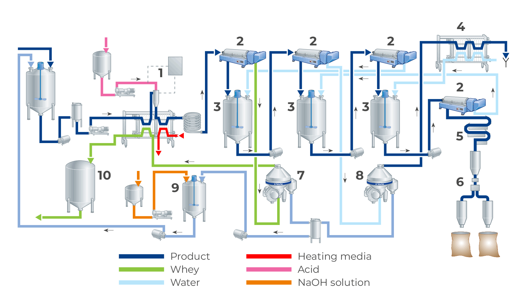 The milk is heated to the required temperature, approx. 32 °C. Mineral acid is then added to bring the pH of the milk to 4.3 – 4.6. Following the pH check, the milk is heated to 40 – 45 °C in a plate heat exchanger and held for about two minutes, when smooth aggregates of casein are formed. To remove as much of the whey as possible before washing starts, the whey/casein mixture is passed through a decanter. This way, less water is needed for washing.