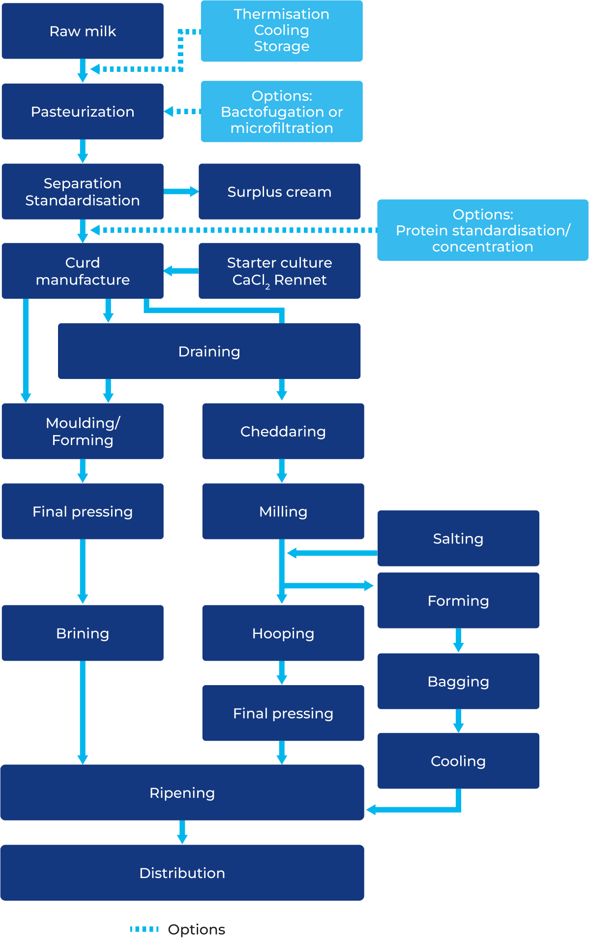 - For cheddar cheese, cheddaring followed by milling, dry salting, block-forming, bagging. Traditional cheddar making; hooping dry salted curd and pressing.