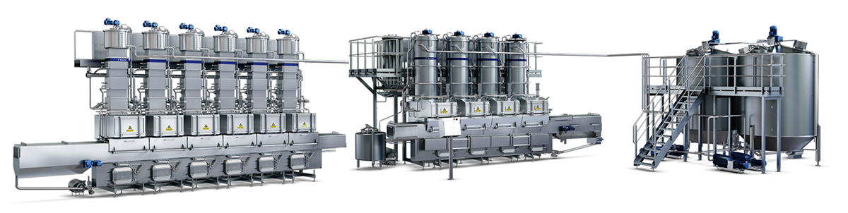Firstly, water, salt and emulsifier/stabiliser are mixed into the cheese. The mixture is heated to 70 – 95 °C, or even higher (depending on the type of processed cheese) in steam-jacketed cookers and by direct steam injection. The cooking time is usually 4 – 5 minutes for block cheese and 10 – 15 minutes for spreads. It is kept constantly agitated during heating, to avoid scorching. The process usually takes place under a vacuum, which offers advantages from the point of view of heating and emulsification. The vacuum also removes undesirable odours and flavours and makes it easier to regulate the moisture content. The capacity of a batch cooker is about 75 kg. The pH of processed cheese should be 5.6 – 5.9 for spreads and 5.4 – 5.6 for sliced types. Variations in the pH of the raw materials are adjusted by mixing cheese of different pHs and adding emulsifiers/stabilisers to adjust the pH. The emulsifiers/stabilisers also bind calcium. This is necessary to stabilise the cheese so that it will not release moisture or fat.