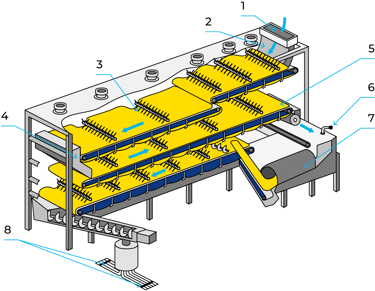 Counter-current washing is employed because it uses water more economically than concurrent washing. The latter system uses one litre of water per litre of skim milk, whereas only about 0.3 – 0.4 litres of water per litre of skim milk is needed in counter-current washing. The number of washing stages is dependent on the requirements of the product, with a minimum of two stages. Fresh water is supplied in the last stage only. After washing, the casein is dewatered in a decanter to a DM content of 45 – 40%. After drying, for example in a vibration dryer, the casein is ground to a particle size corresponding to 40, 60, or 80 mesh, and packed in sacks. (Mesh = number of screen lines per inch; 40 mesh thus corresponds to 0.64 mm.)