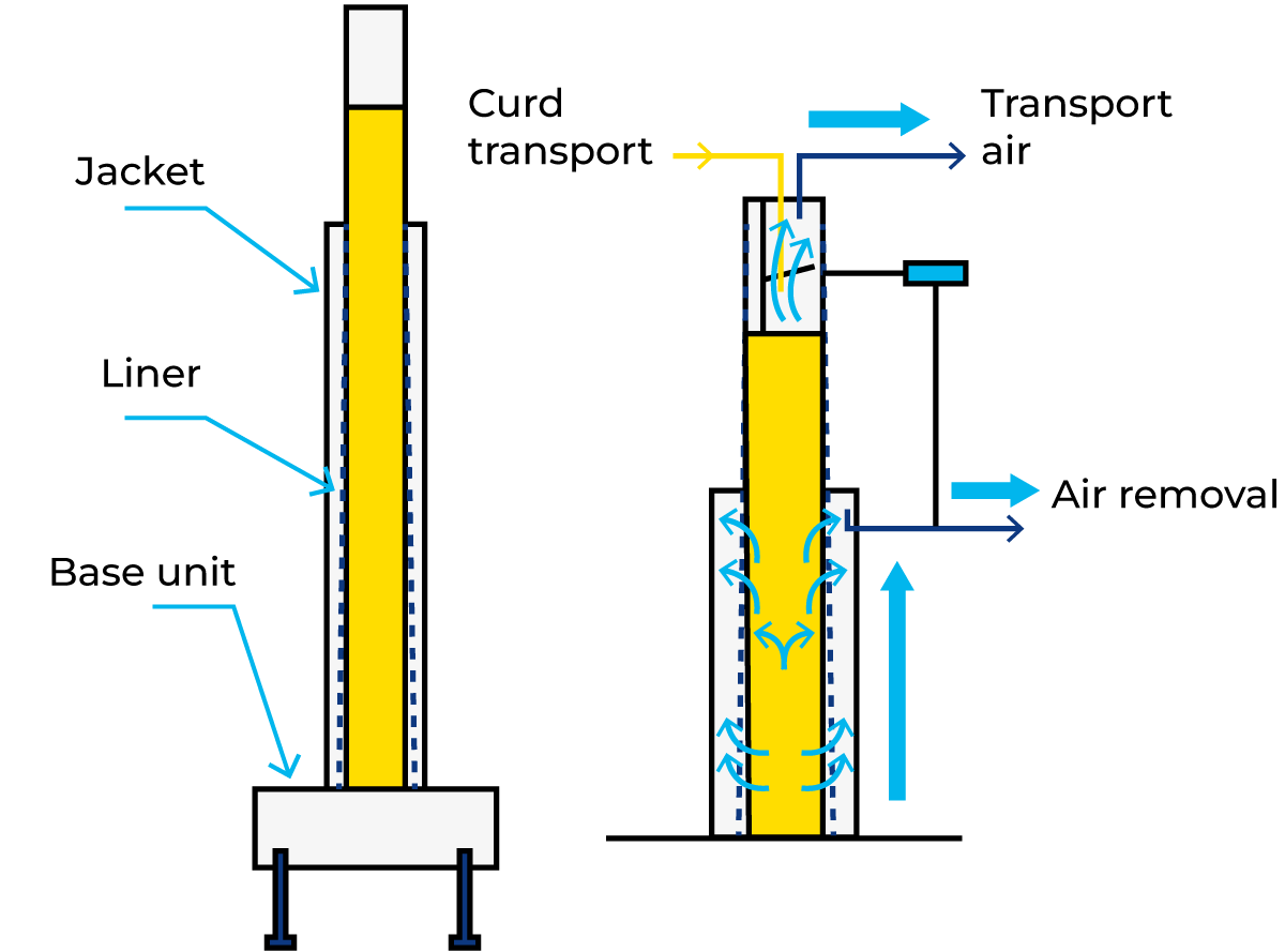 - For (semi-)hard cheese, collection of curd for pre-pressing and/or final moulding/pressing and brine salting
