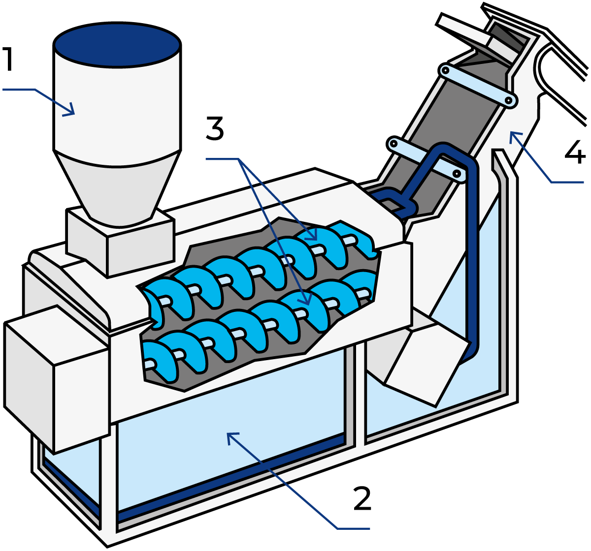 Rennet casein was originally produced in batches in special casein tanks, but now continuous processes are also used. In a continuous plant, drainage of whey takes place before the casein passes through two or three washing tanks with agitators. De-wheying is normally done in a decanter centrifuge to reduce the consumption of wash water. The casein is dewatered between washing stages, either on inclined static strainers or in decanters. After leaving the washing stages, the water/casein mixture goes through another decanter to discharge as much water as possible before final drying.
