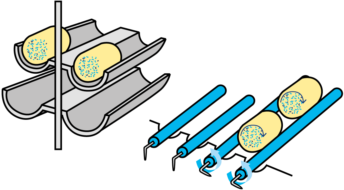 Figure 16.44 shows the various stages of rennet casein production. Renneting takes place with the help of the enzyme chymosin in the rennet. The milk is heated for a short period of time and then cooled to about 30 °C. Then the rennet is added. A gel forms after 15 – 20 minutes, which is then cut and the coagulum is stirred while being heated to about 60 °C. This high temperature is needed to deactivate the enzyme. Cooking time is around 30 minutes.