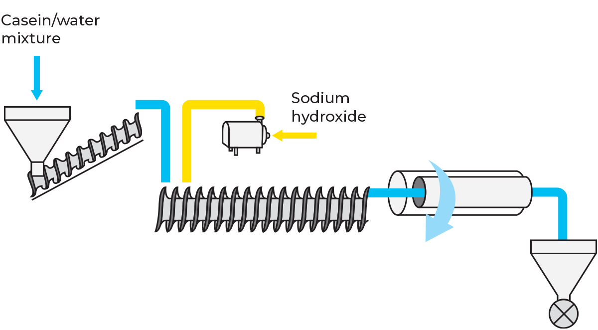 Most of the published information gives dry casein as the starting material. Water and alkali are added to form a mixture for extrusion. The casein/water mixture may have a moisture content of 10 – 30%.