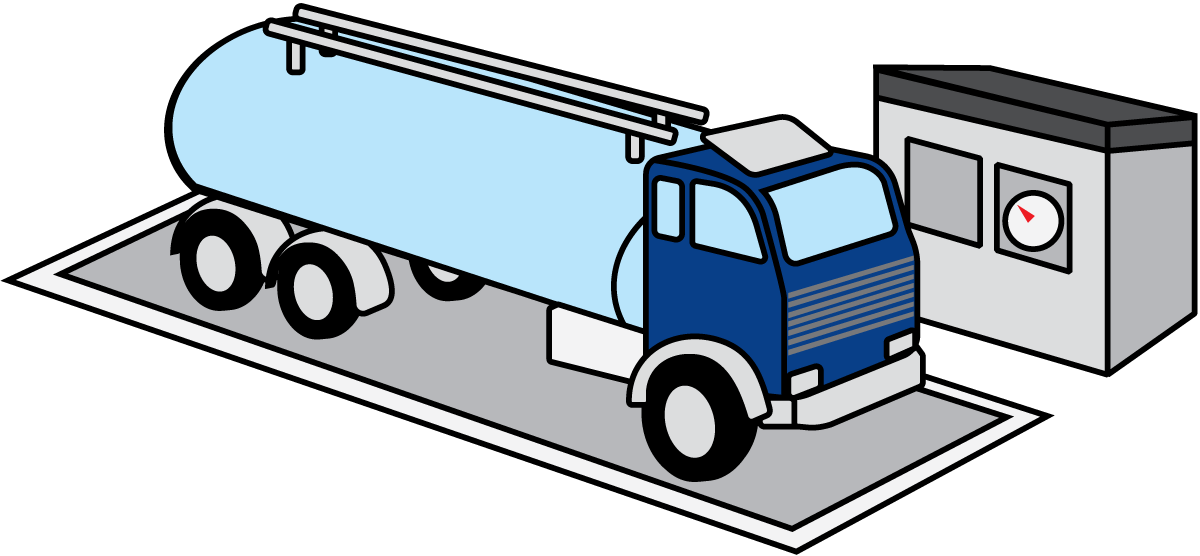 When the weight bridge method is used, the tanker is driven from the entrance to the weight bridge and the total weight is recorded. After unloading, the empty tanker is again weighed and the amount of milk is calculated. Before being weighed, the tanker normally passes a vehicle-washing station. This is of special importance when the weather is bad.