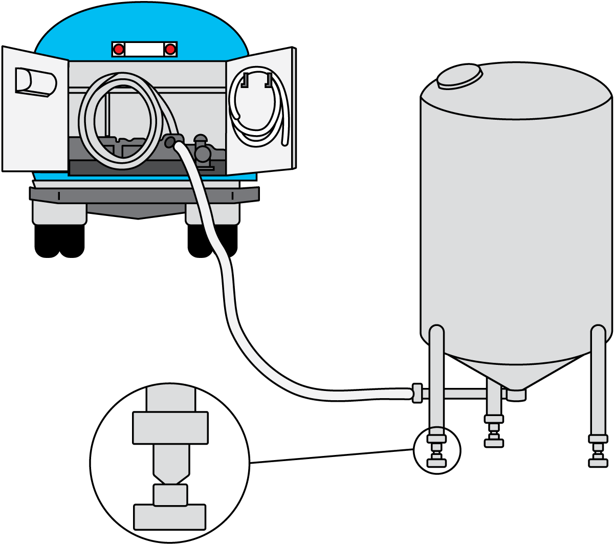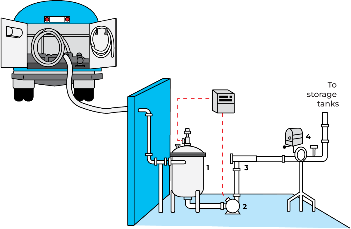 The tanker outlet is connected to an air-eliminator and from this, the milk – free from air – is pumped through the flowmeter, which continuously indicates the total flow. When all the milk has been delivered, the total amount is recorded.