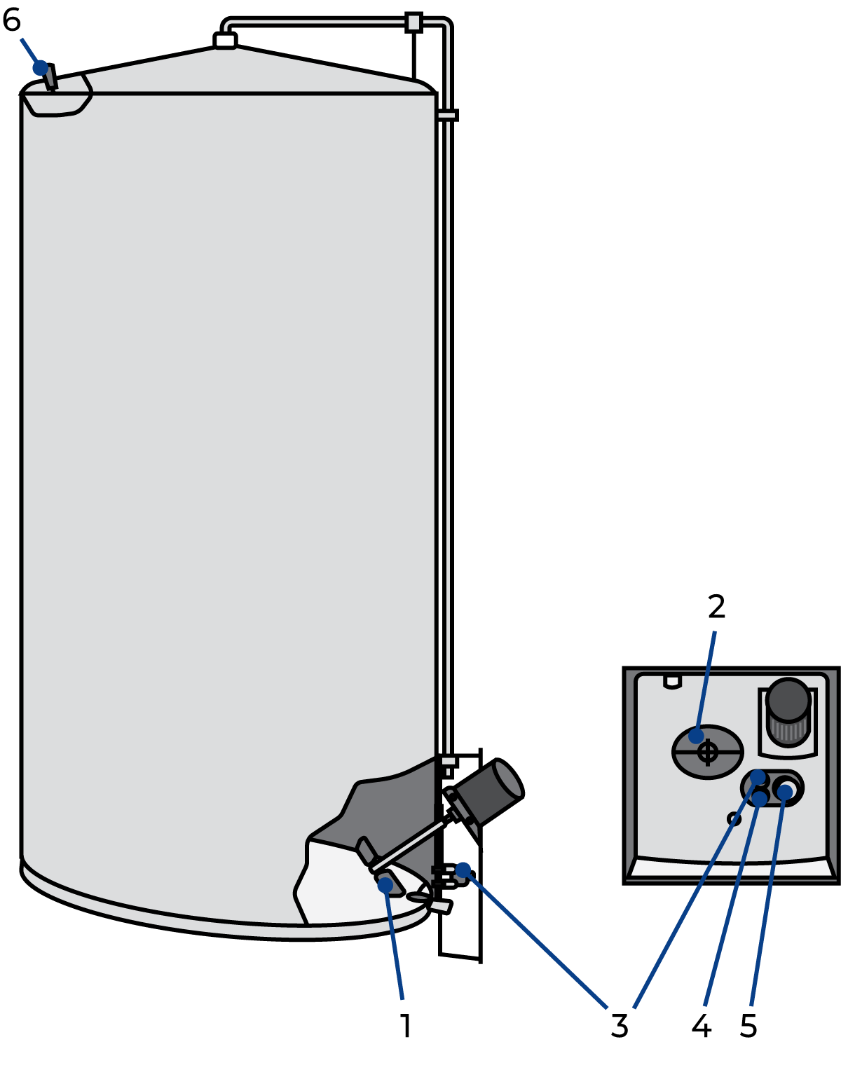A level sensor in the alcove is used to monitor the level in the silo. This information is used to plan the unloading of the milk at reception and its transfer to the process. It is also used to stop the agitator(s) when the level drops too low. Running the agitator at a low level will cause air intrusion.