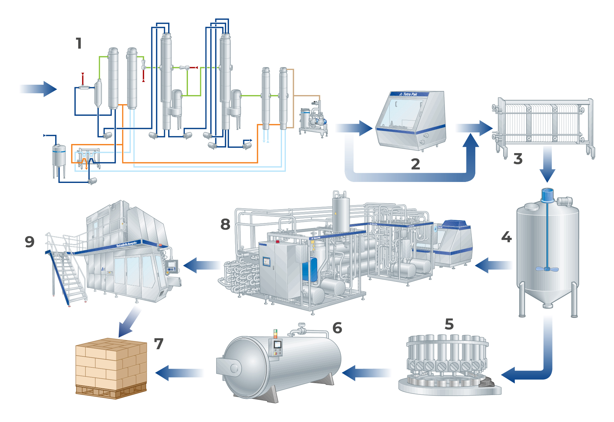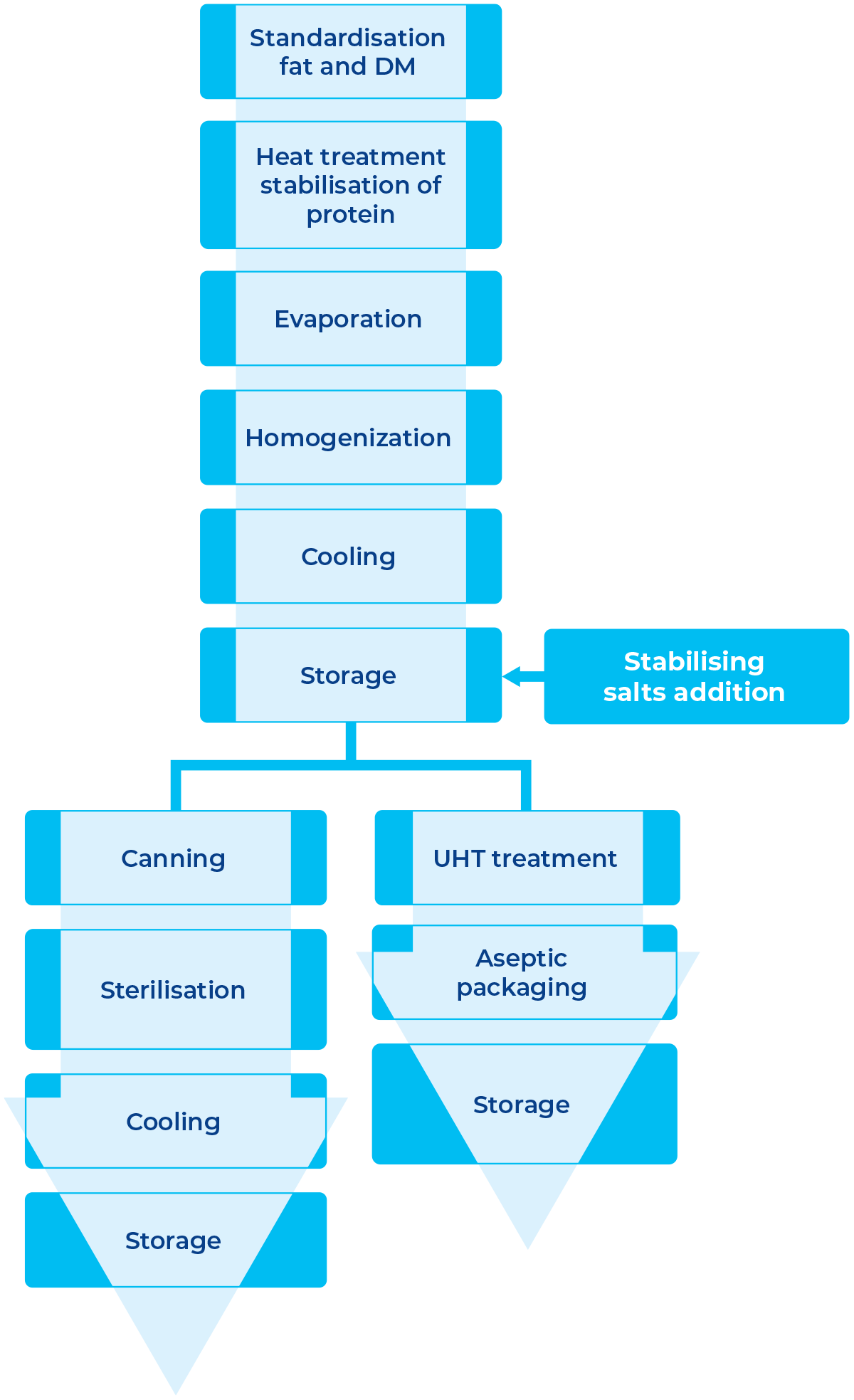 In the case of UHT-treated products, the stabilised concentrate is first sterilised and then packed aseptically.