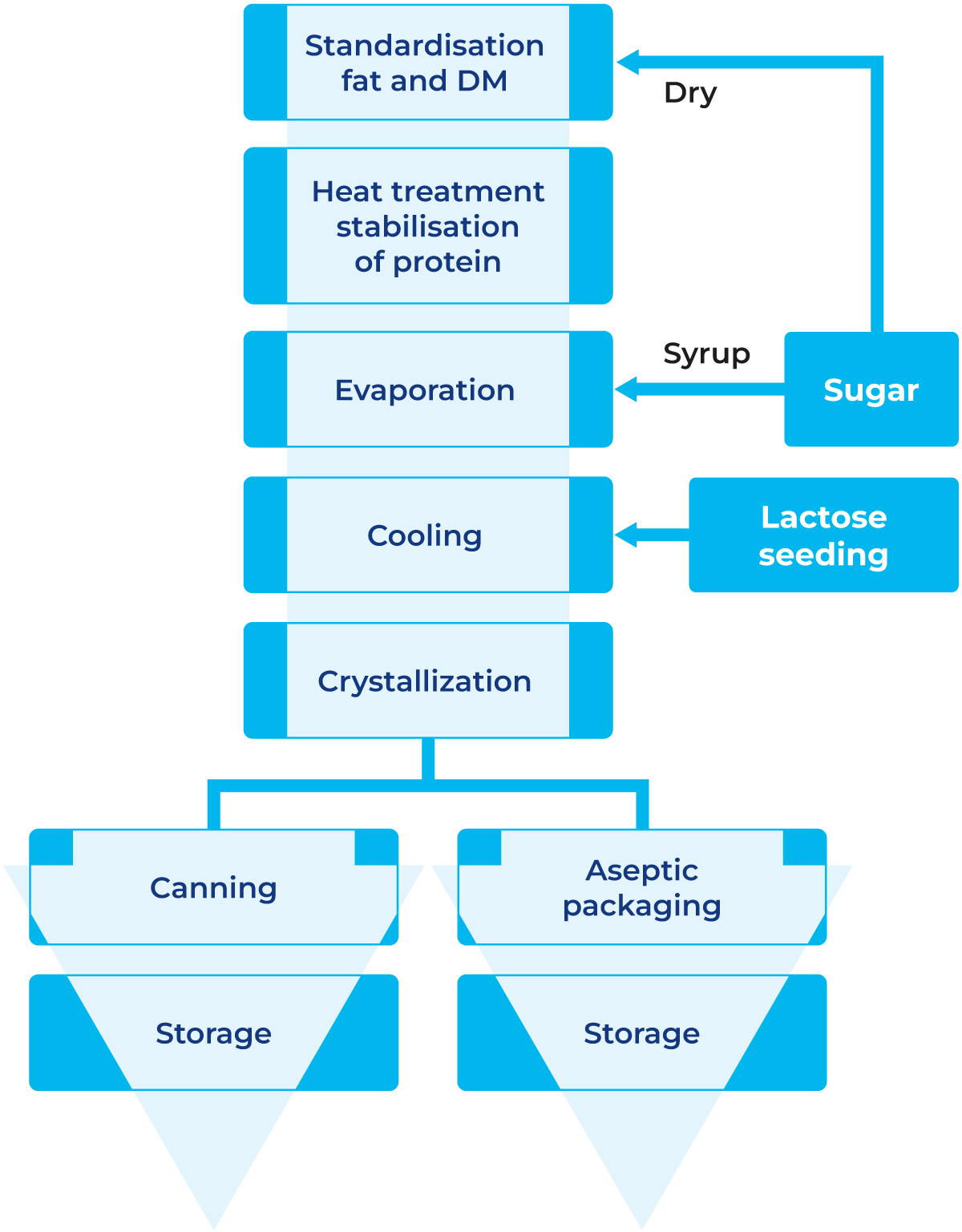 The condensed milk is made from fresh milk or recombined with skim milk powder, buttermilk powder, fat (AMF or vegetable fat) and water (see also Chapter 20, Recombined milk products). When using vegetable fat, the product is called “filled”. The increased dry matter is reached through either evaporation, RO concentration of fresh milk or by recombination from milk powder.