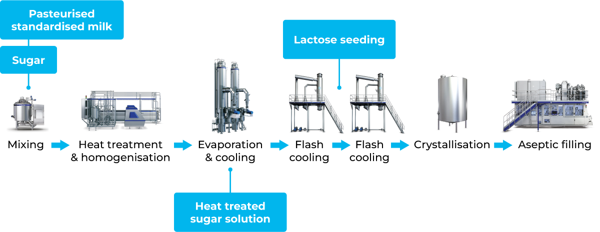 These conditions are created by using two flash cooling steps. In the first, the condensed milk is cooled from about 60 to 35 °C and in the second from 35 to 18 °C. In between these two flash coolers, the lactose seeding takes place.