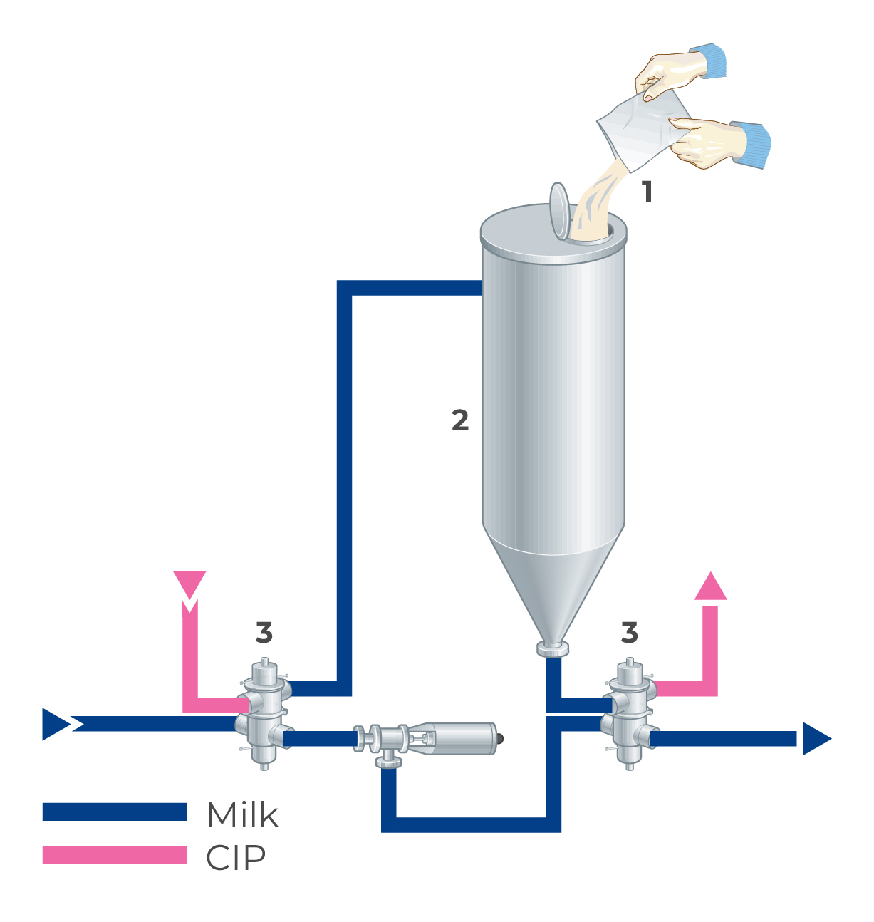 The highly concentrated culture can be inoculated directly in the milk stream prior to the incubation tank. A bypass line including a small container is connected to the milk pipe illustrated in Figure 12.5. The container is loaded with freeze-dried or deep-frozen culture enough for inoculation of one incubation tank. When the operator decides to inoculate the tank during milk filling, he opens the valves for the bypass line and the milk will bring in the culture to the tank.