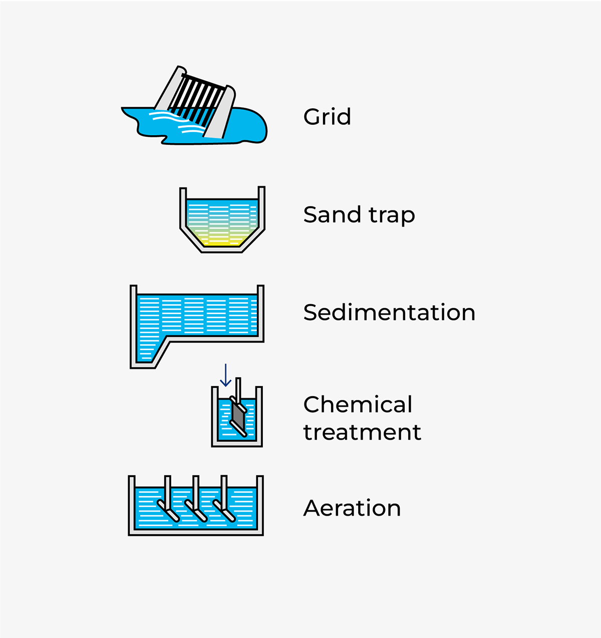 The primary (mechanical) stage of sewage treatment comprises a strainer grid, sand trap and primary sedimentation basins.