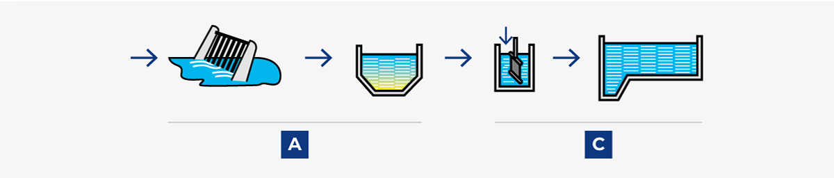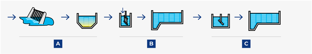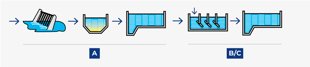 Conventional three-stage process with A mechanical, B biological, and C chemical treatment. Effective and reliable, but fairly expensive.