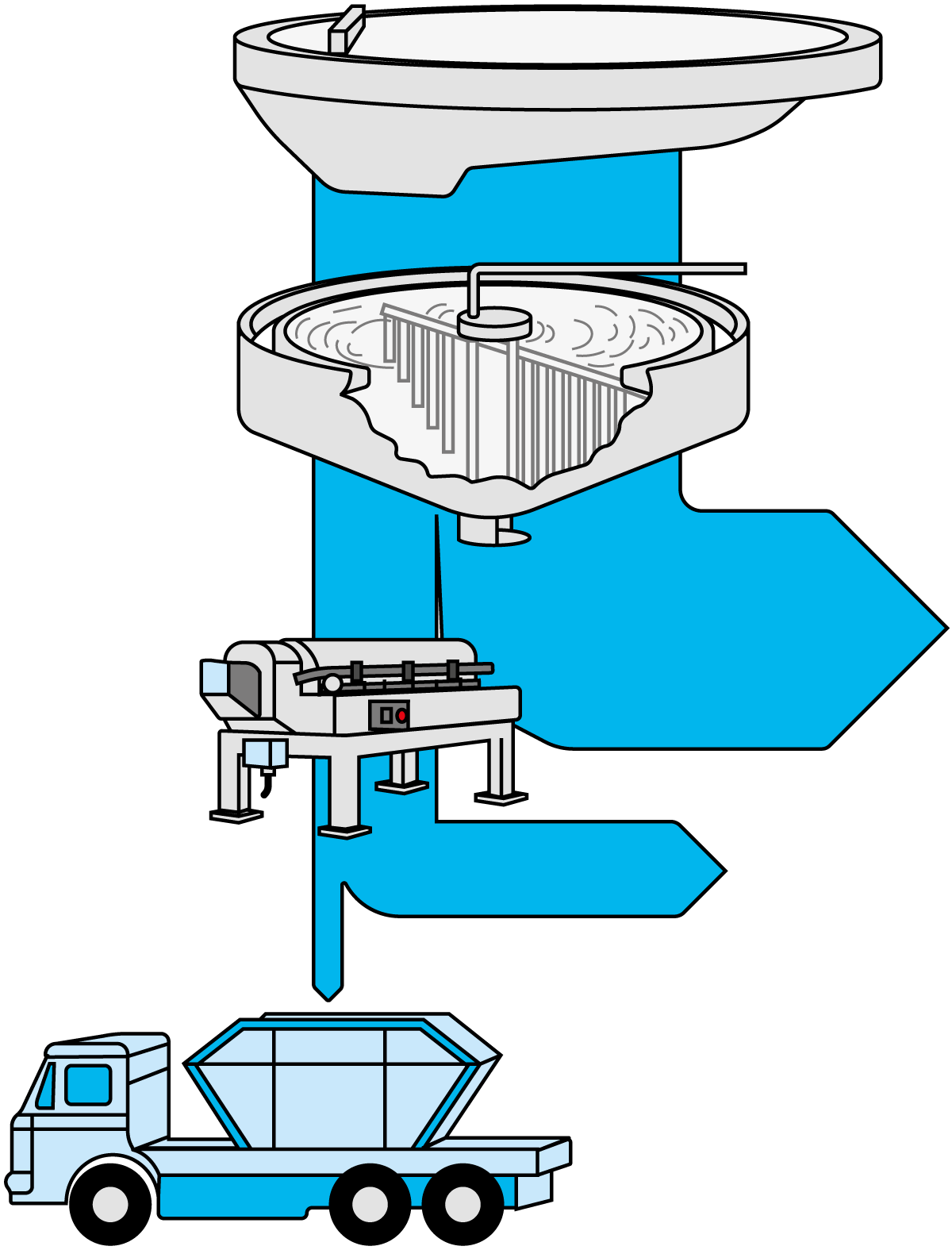 Digester sludge is a homogeneous, practically odourless, dark-coloured substance which still has a high moisture content of around 94 – 97%. It is therefore dewatered, most effectively in a decanter centrifuge, which discharges a solid phase of about one-eighth of the original volume, as shown in Figure 23.5.