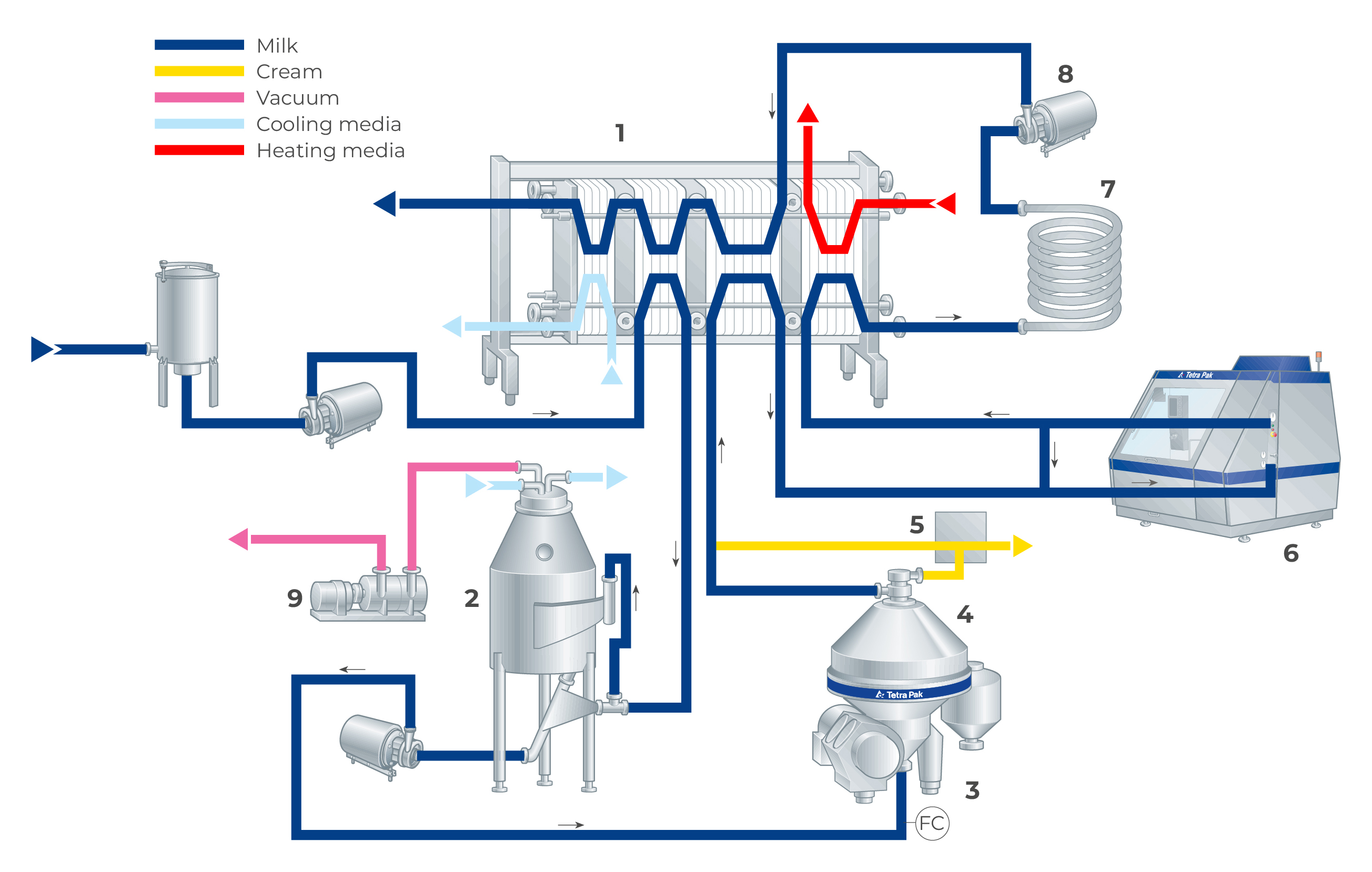 On the way down towards the outlet, which is also located tangentially, the velocity decreases. The feed and discharge capacities are thus identical. The deaerated milk, now at a temperature of 60 °C, is separated, standardized and homogenized before returning to the pasteurizer for final heat treatment.
