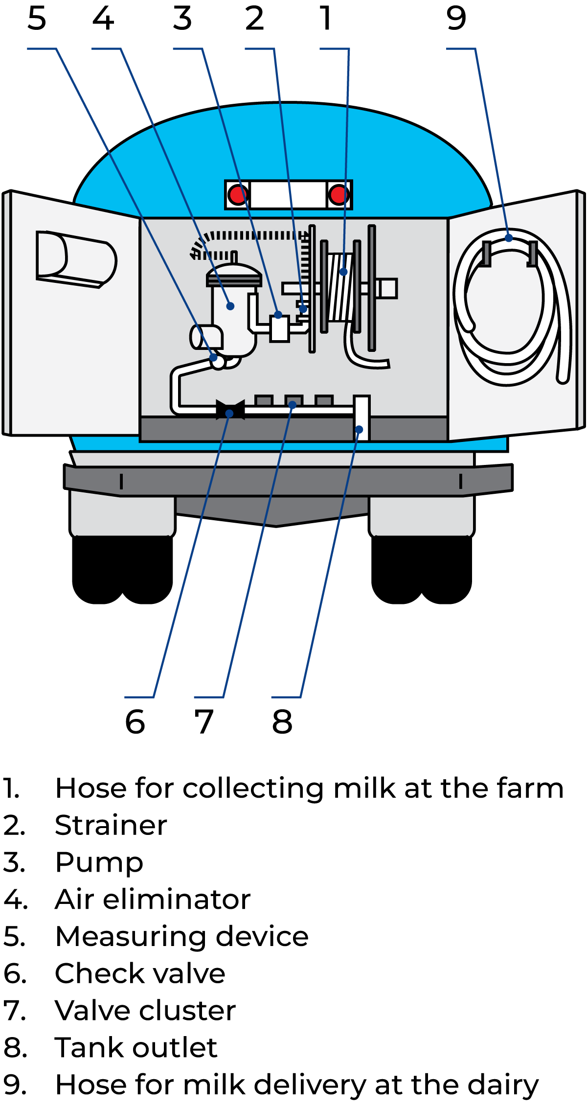 While the level of milk rises in the air eliminator, the float inside also rises; at a certain level, the float closes the valve at the top of the vessel. The pressure inside the vessel increases and the check valve (6) is released. The milk flows via the measuring unit (5) to the valve cluster (7) and the tanks in the tanker. The tanker is emptied through the outlet (8) by the hose (9).