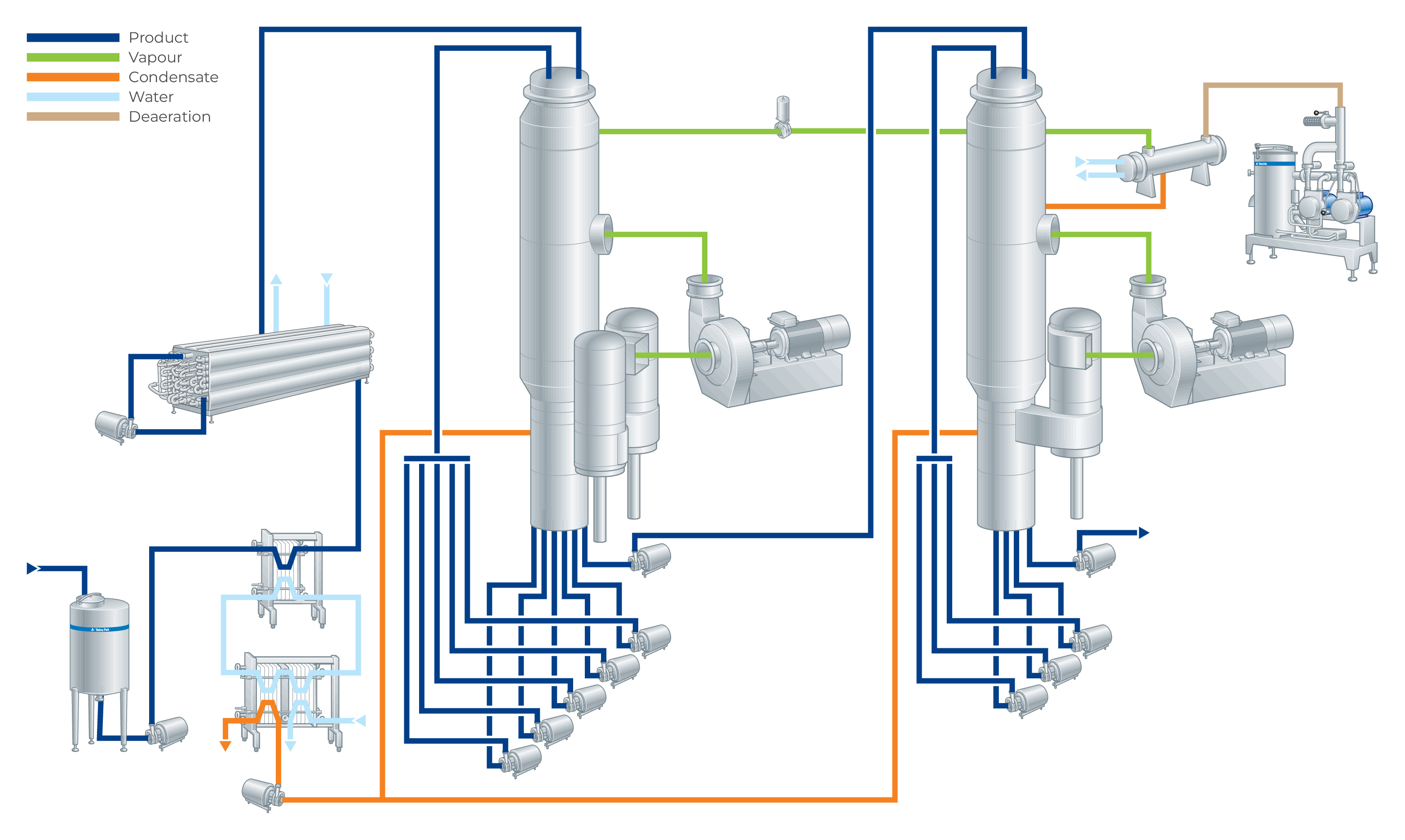 The product is pumped to the top end of the first heating section and distributed to its tubes. The volume of the product is reduced by the evaporation of water that takes place during the downflow. At the bottom end of the section, the vapour evolved is removed and the product is collected in a sump. The product is pumped into the next section and back to the top end of the calandria.