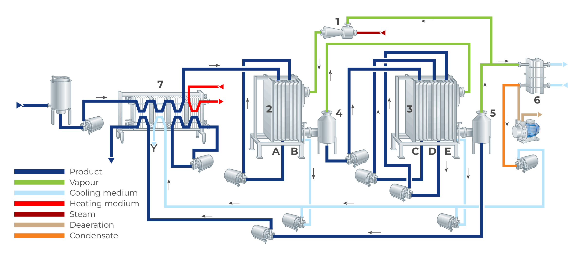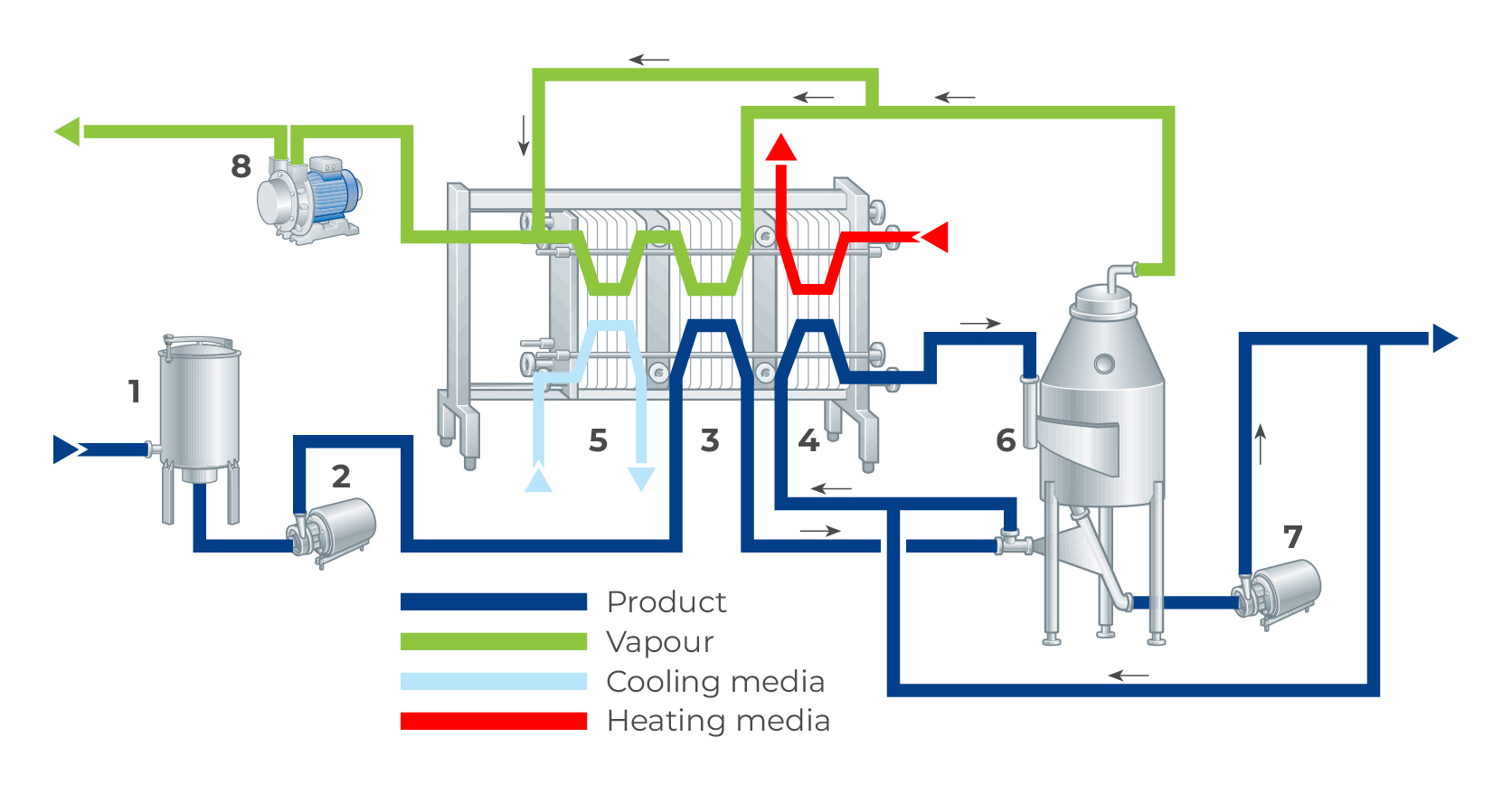 The injection of high-pressure steam into the thermocompressor (7) increases the pressure of the vapour from the first effect. The live steam/vapour mixture is then used to heat the first effect (4).