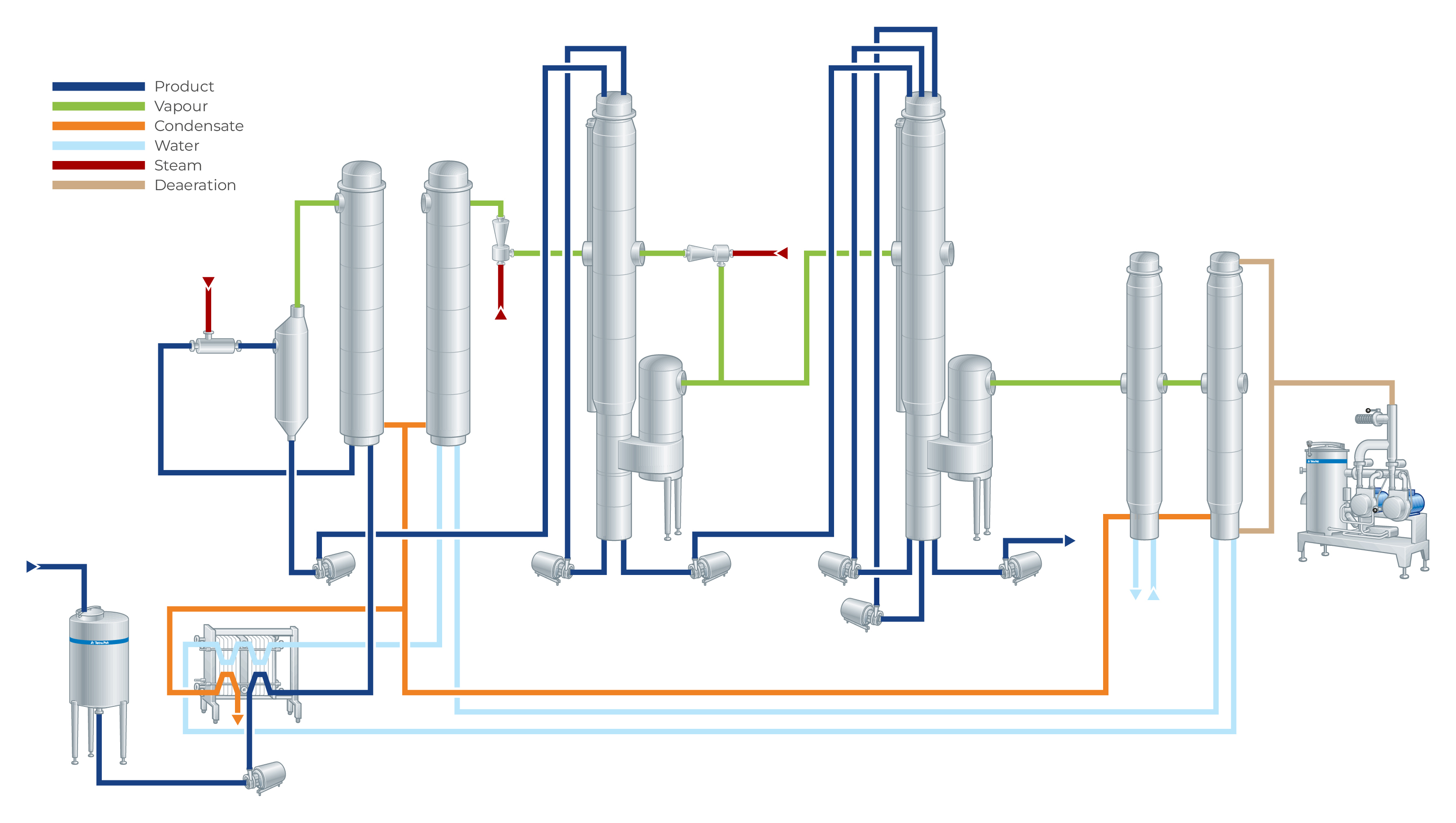 This structure allows whey, for example, to be concentrated from a solids content of 6% to a solids content of 32%, or 20% to a solids content of 60%, and skim milk to be concentrated from a solids content of 9% to a solids content of 36%.