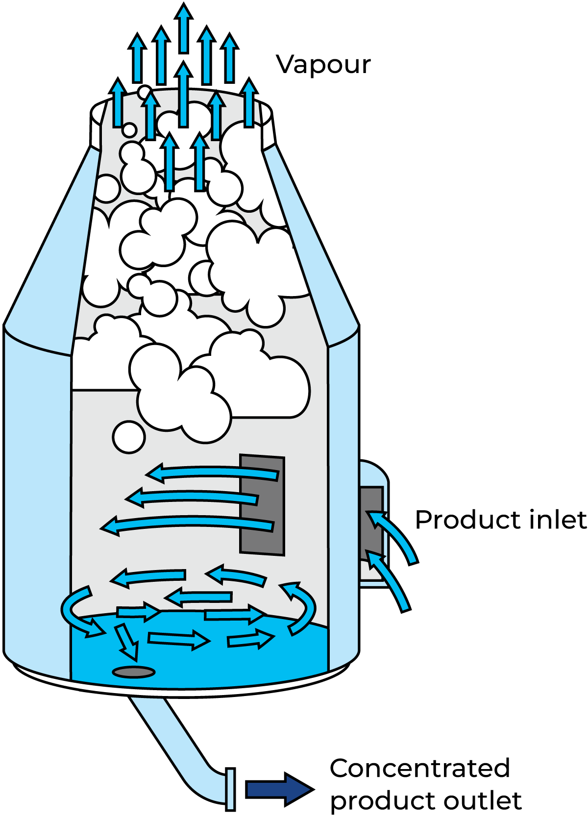 As evaporation proceeds, the volume of liquid decreases and the volume of vapour increases. If the vapour volume exceeds the available space, the velocity of the vapour will rise, resulting in a higher pressure drop. This will require a higher temperature difference between the heating steam and the product. To avoid this, the available space for vapour must be increased as vapour volume increases.