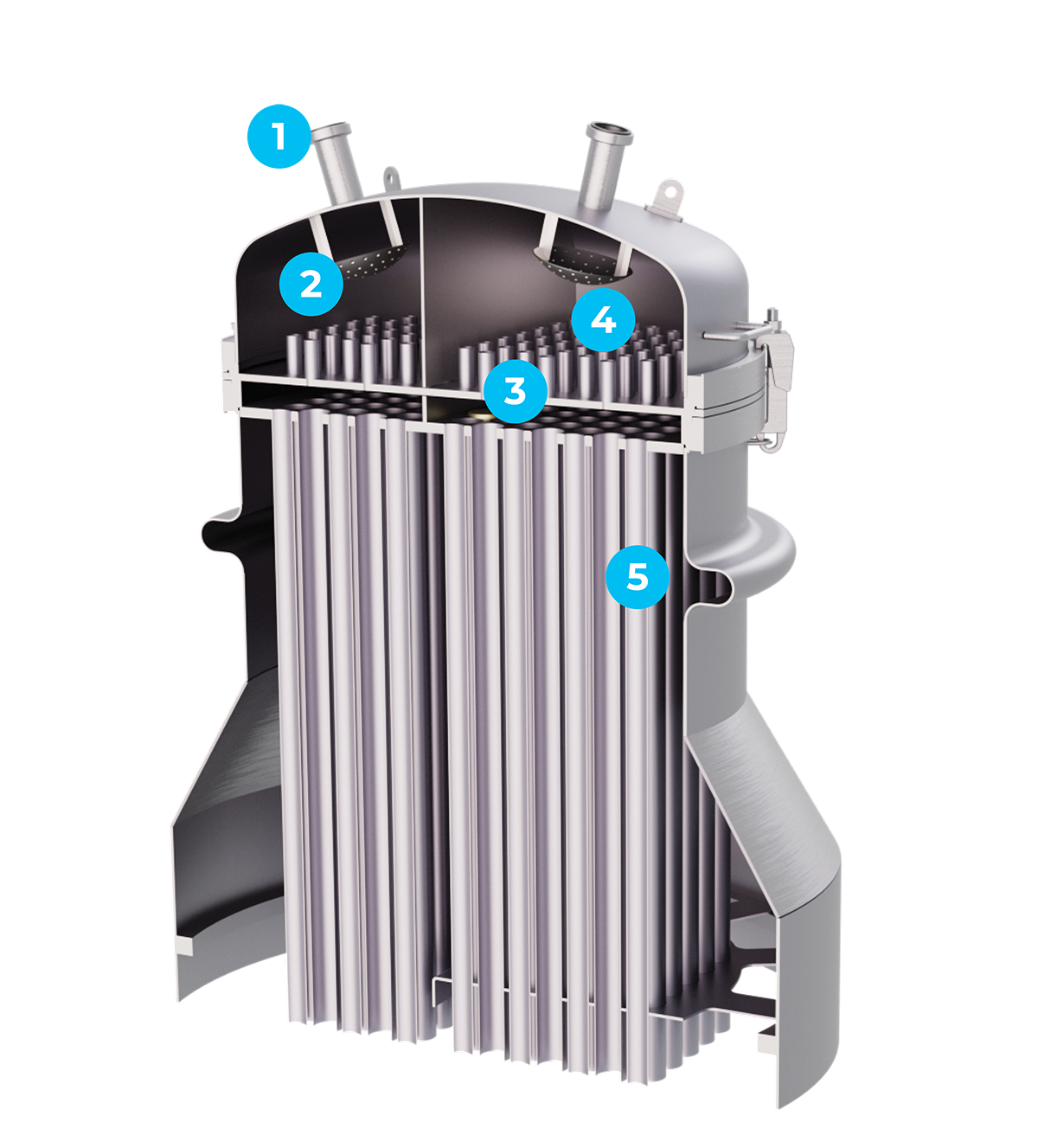 A pasteurizer heated with live steam is installed before the MVR effect in the system. Excess vapour is condensed in a separate condenser. Mechanical vapour recompression makes it possible to evaporate 80 – 100 kg of water with 1 kWh. Using an evaporator with mechanical vapour recompression can halve the operating costs compared to a conventional six-effect evaporator with a thermocompressor.