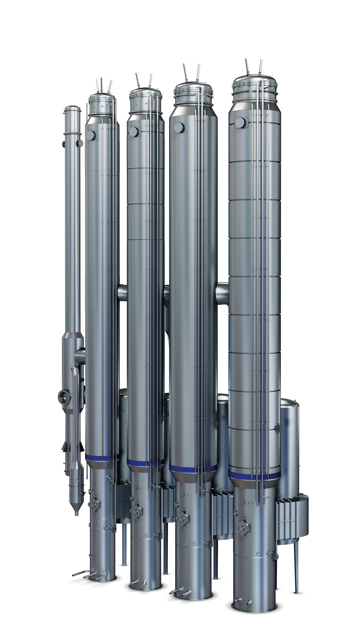 Demand for lower energy consumption has led to the development of facilities with more than six effects, but certain limits must be observed in this instance. The maximum boiling temperature on the product side is normally no more than 70 °C in the first effect and 40 °C in the last.