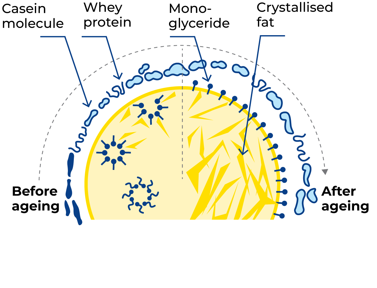 If vegetable fat is utilised, then it is essential that the fat can re-crystallise, i.e. go from liquid to solid form during the ageing process. Solid fat is important during the continuous freezing process, where it can partially agglomerate to create the air cell membrane.