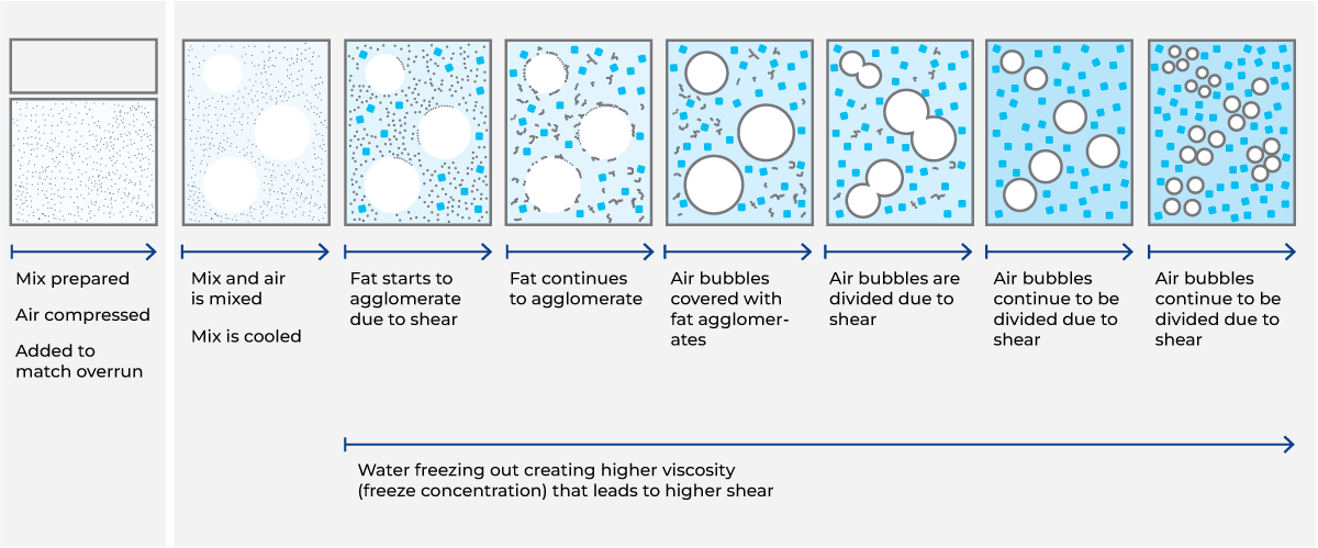 During the continuous freezing process, about 50% of the water in the mix is frozen into ice crystals, resulting in a freezing concentration where the concentration of carbohydrates, minerals and proteins becomes so high that the subsequent viscosity of the ice cream is significantly increased. This increase in viscosity affects the mechanical processing during the continuous freezing process, whereby the fat globules churn out and form partial fat agglomerates at the phase transition between air and water. This creates a membrane of partially agglomerated fat on the air cells and creates the ice cream structure.