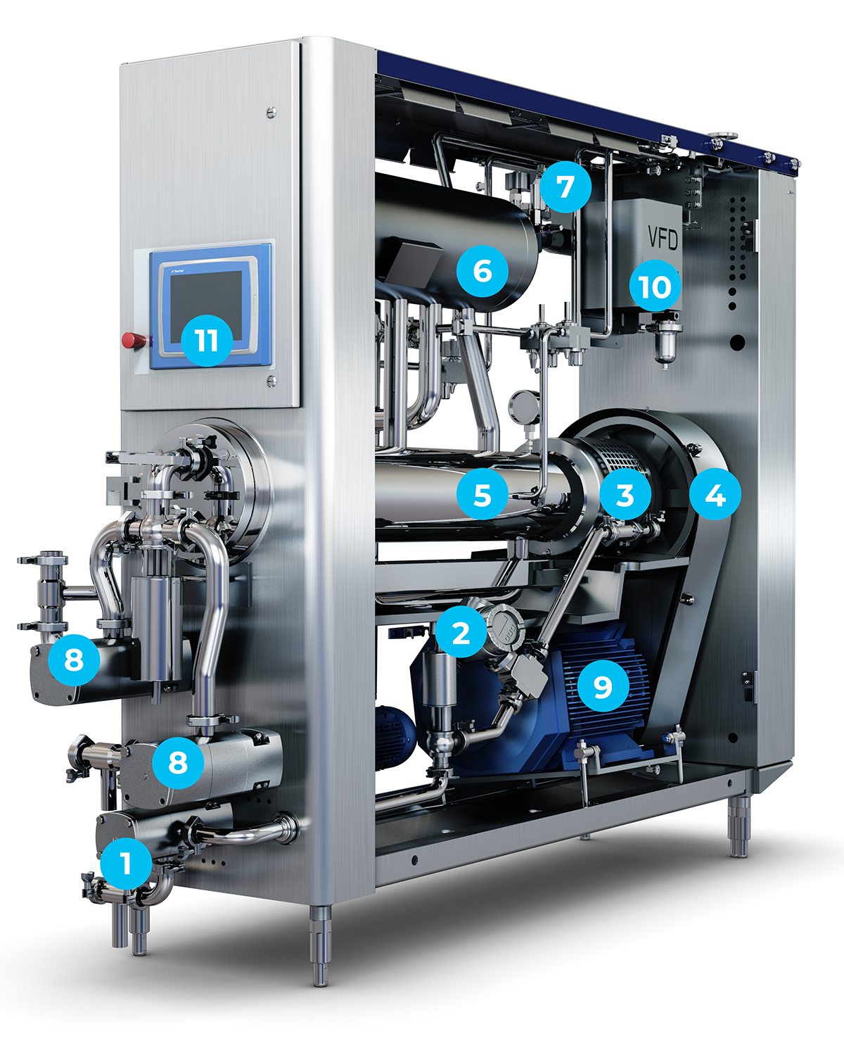 The main motor can be equipped with a variable frequency drive (VFD) to allow the speed of the dasher to be regulated. Adjusting the dasher speed affects the mechanical shear of the product in the cylinder to optimise the freezing process. Increasing dasher speed provides higher mechanical shear, and thereby higher partial agglomeration of the fat globules (churning), which often results in a stronger and creamier structure of the products. However, an increased rotational speed of the dasher results in more energy provided to the freezing process in the cylinder, which can result in a reduced amount of water freezing in the process.