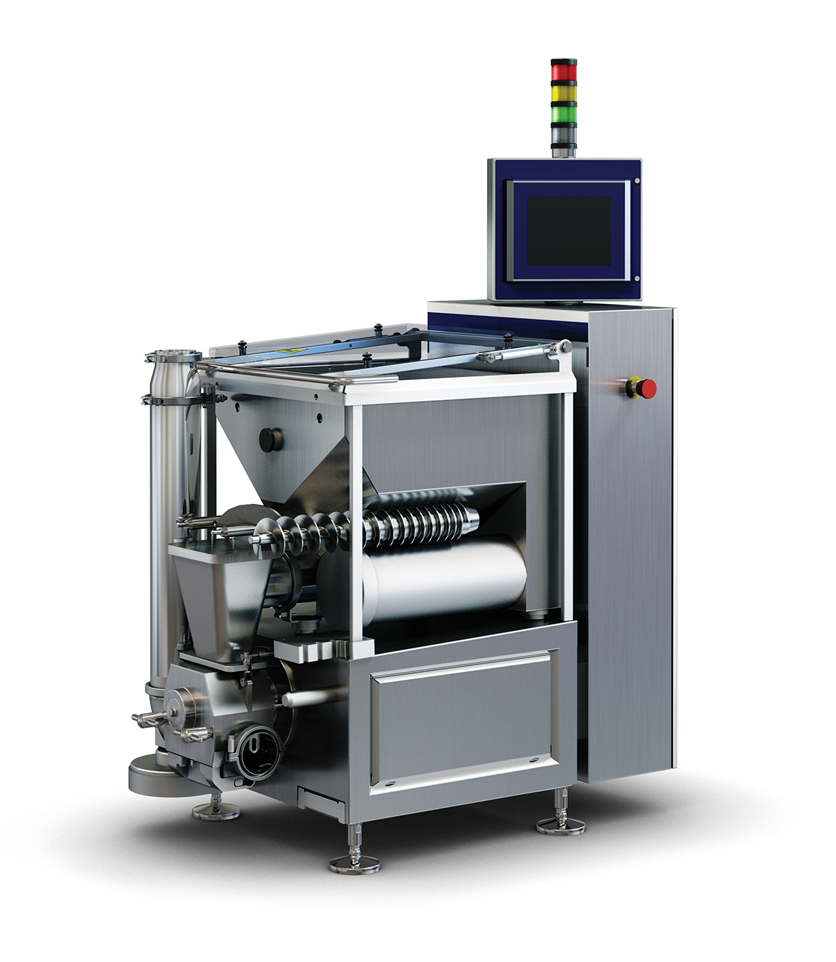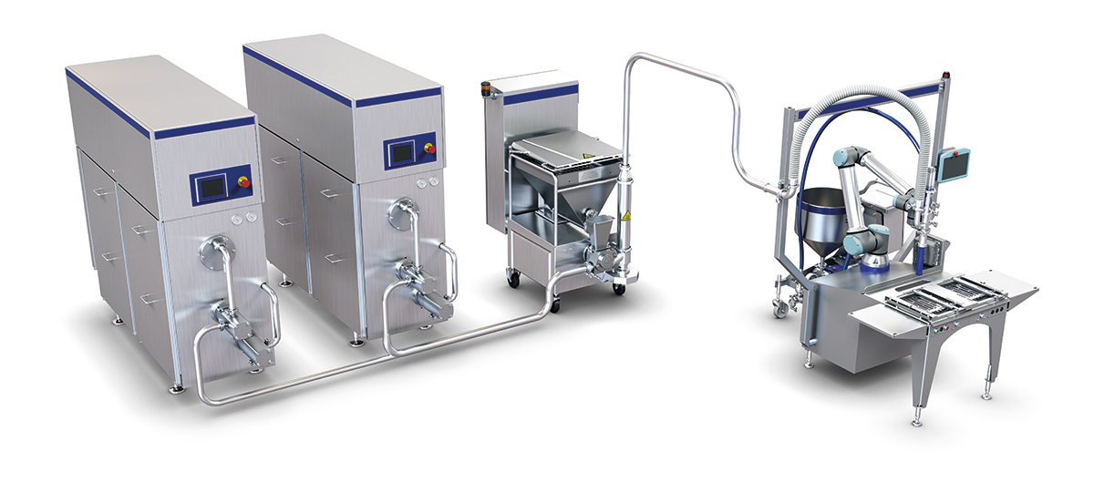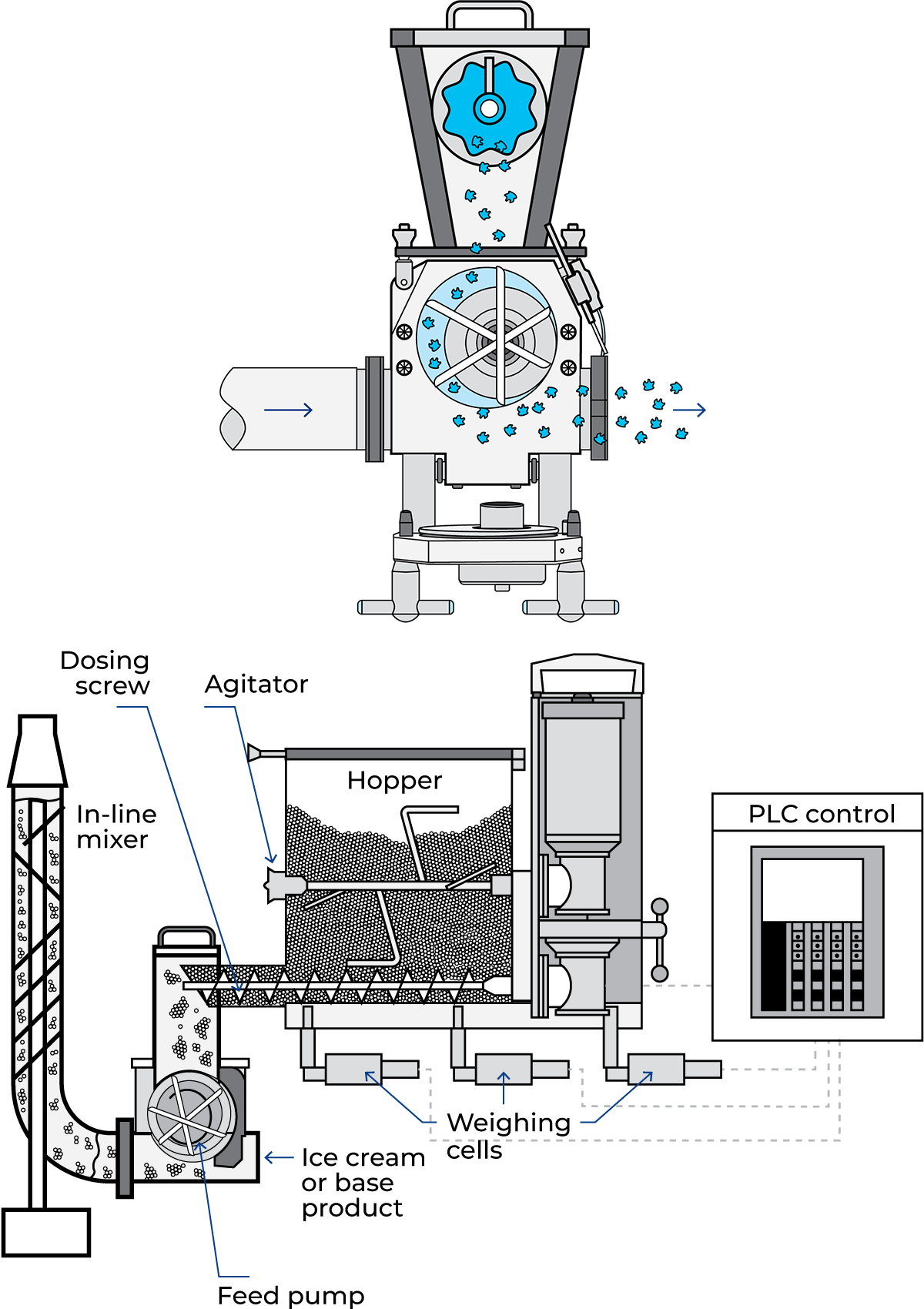 An ingredient dosing unit is placed on the process line, where the semi-frozen product from the continuous freezer is mixed with the ingredients.