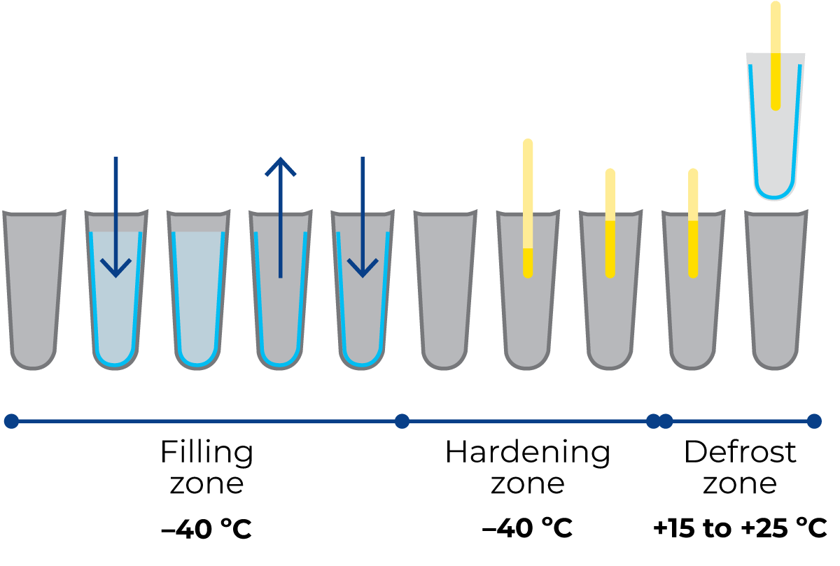 The illustration shows an example of a shell-in-core product. The mould is first filled with a water-ice mix where the outer layer is frozen. The non-frozen water-ice mix is removed using a vacuum pump, and the mould is then filled with an ice cream mix. A stick is inserted when the product is partially frozen. After hardening, the product enters the defrost zone where 15 °C to 25 °C water is sprayed onto the moulds, generating a melting film that enables the extraction of the products.