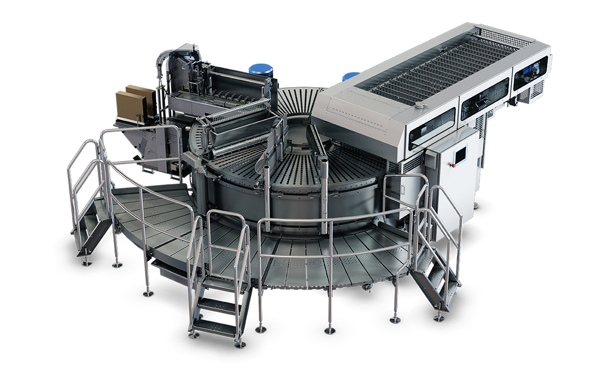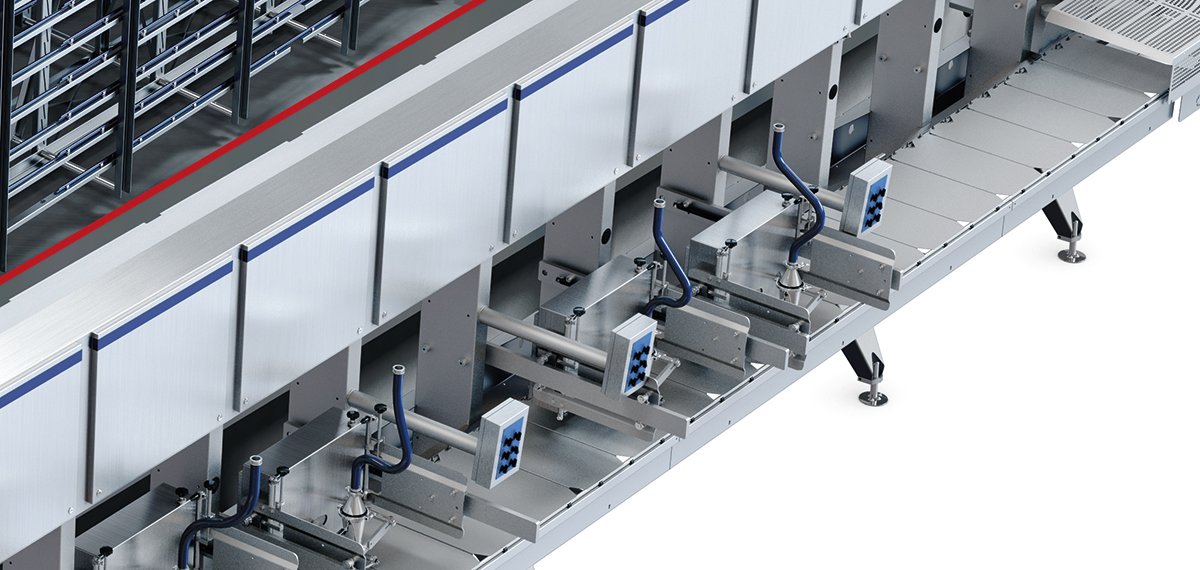 Since the products are frozen to the trays, there is a need to loosen them (product release). Here, a pneumatic tapping device releases the products, while the products are held in position. If the products lose position, there may be challenges in picking them up from the trays, which results in increased waste on the line.