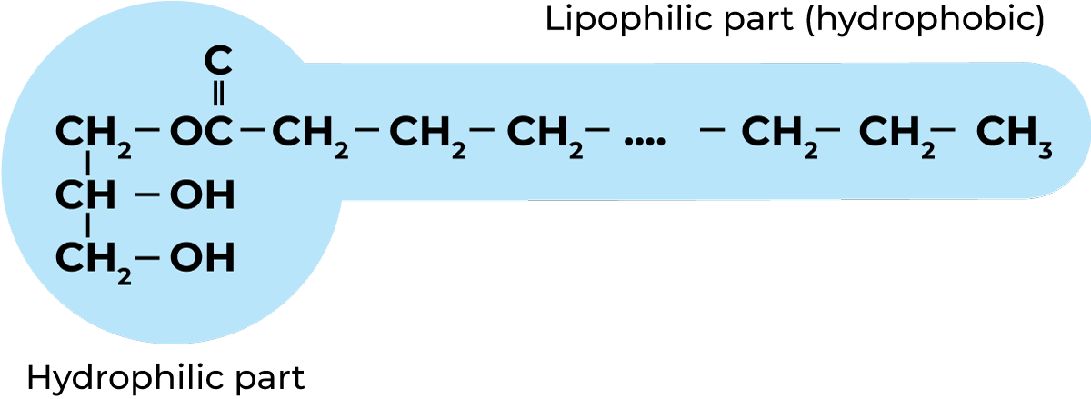 Mono- and diglycerides of fatty acids are produced from a vegetable oil/fat product (triglyceride), where one or two of the fatty acids on the glycerol are removed. This results in a molecule that has a lipophilic (“fat-loving”) part and a hydrophilic (“water-loving”) part, creating a molecule that can act as a link between fat and water, thereby making an emulsion of fat-in-water.