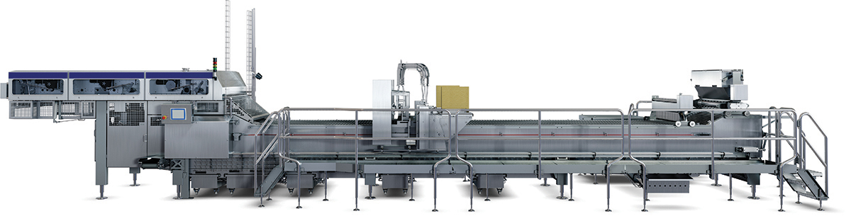 The ice cream products can be individually wrapped in paper. This is done on the wrapping unit, where the products are placed in a continuous string of paper. The paper is assembled and sealed around the products (fin sealing) followed by sealing and cutting (cross-sealing) across the paper direction so that the products are individually packed.