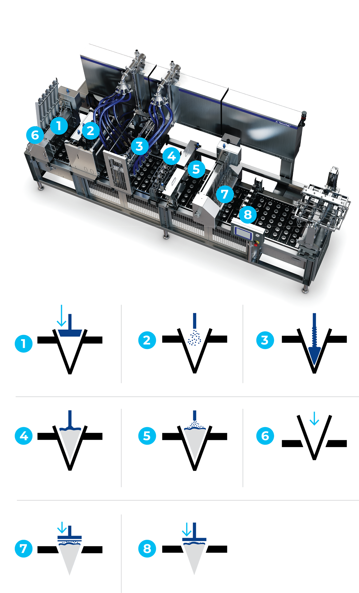 After the continuous freezing process, the ice cream can be filled into a cup or container of various sizes, shapes and types. It can also be filled in wafers. Most flat-top wafers are made on a filling unit. A filling unit is characterised as an indexed operation.