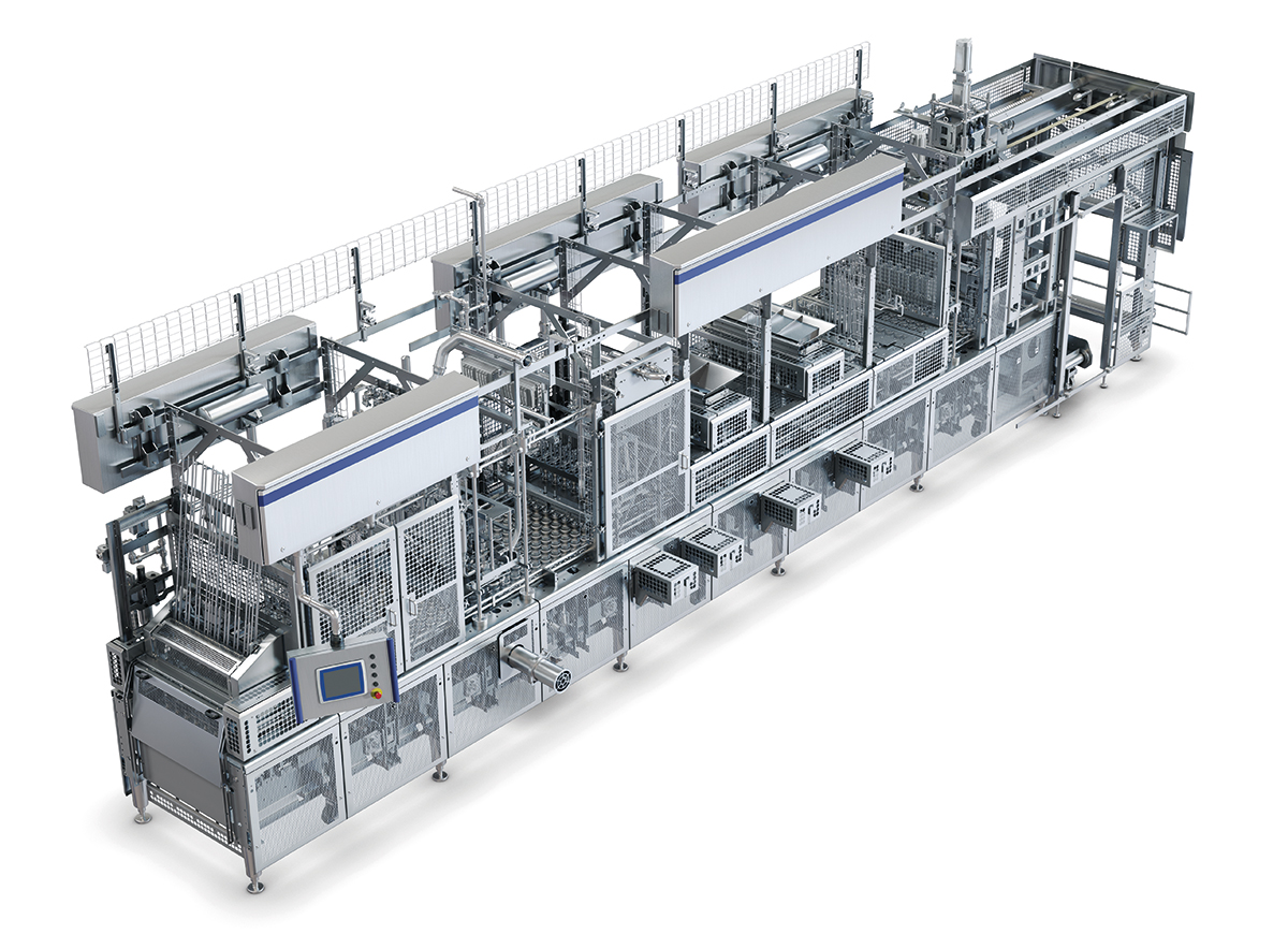 The moulding unit can be designed as an inline process, where the working area is not limited to 360° as the rotary moulder, and thus more complex variants can be made. The functionality is identical to the rotary moulding unit.