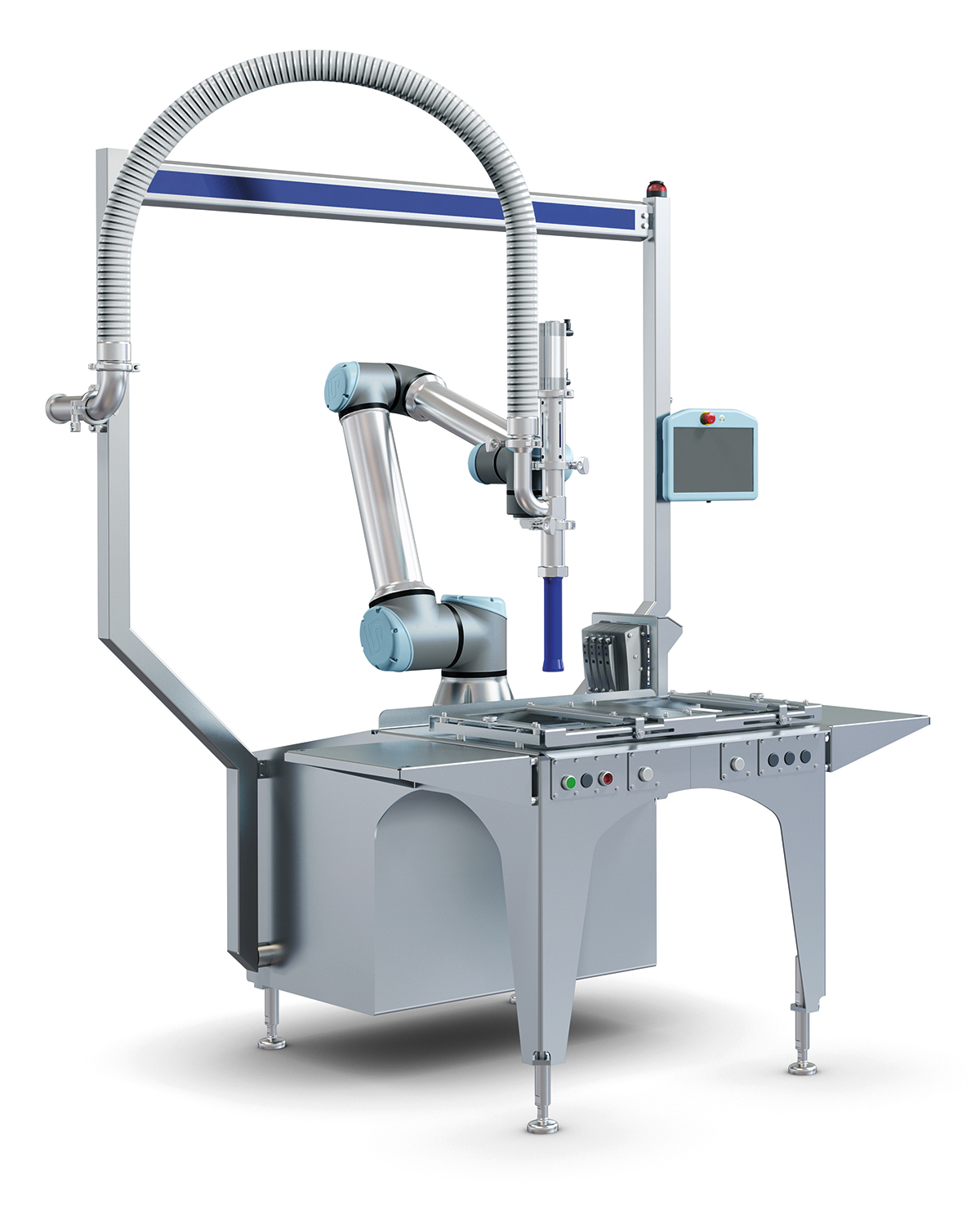It is possible to fill containers with a robotic filling unit. Collaborative robots have the advantage that they do not require safety guards – as they stop moving when touched – and can manually learn certain filling patterns. This makes it possible to fill containers with unique patterns.