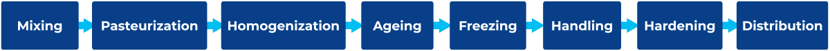 Processing in ice cream making consists of different stages: mixing, pasteurization, homogenization and ageing, as well as further processing in which the ice cream is frozen, shaped and hardened.
