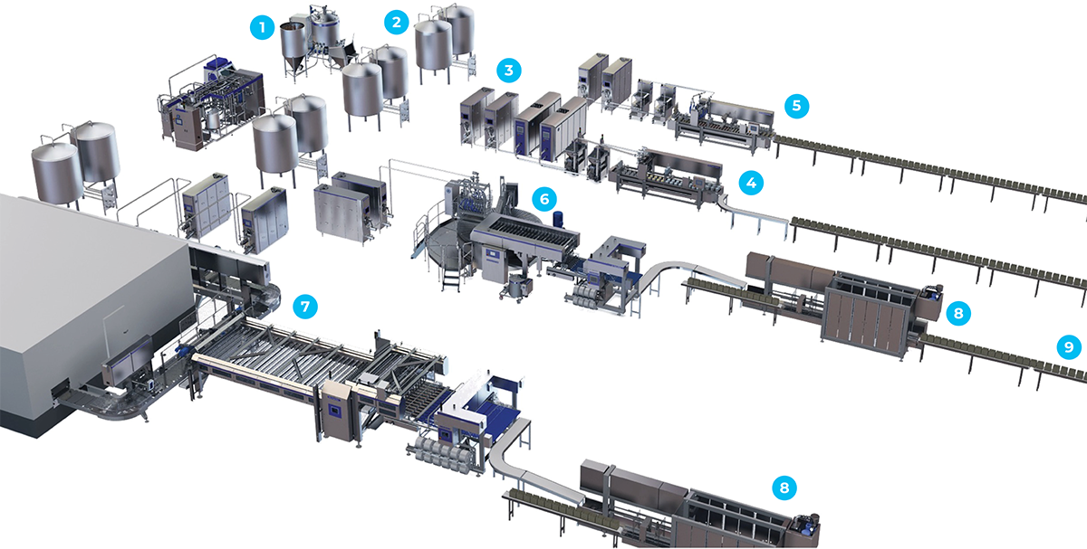 The illustrated plant layout illustrates the process unit placement and product flow in ice cream production.