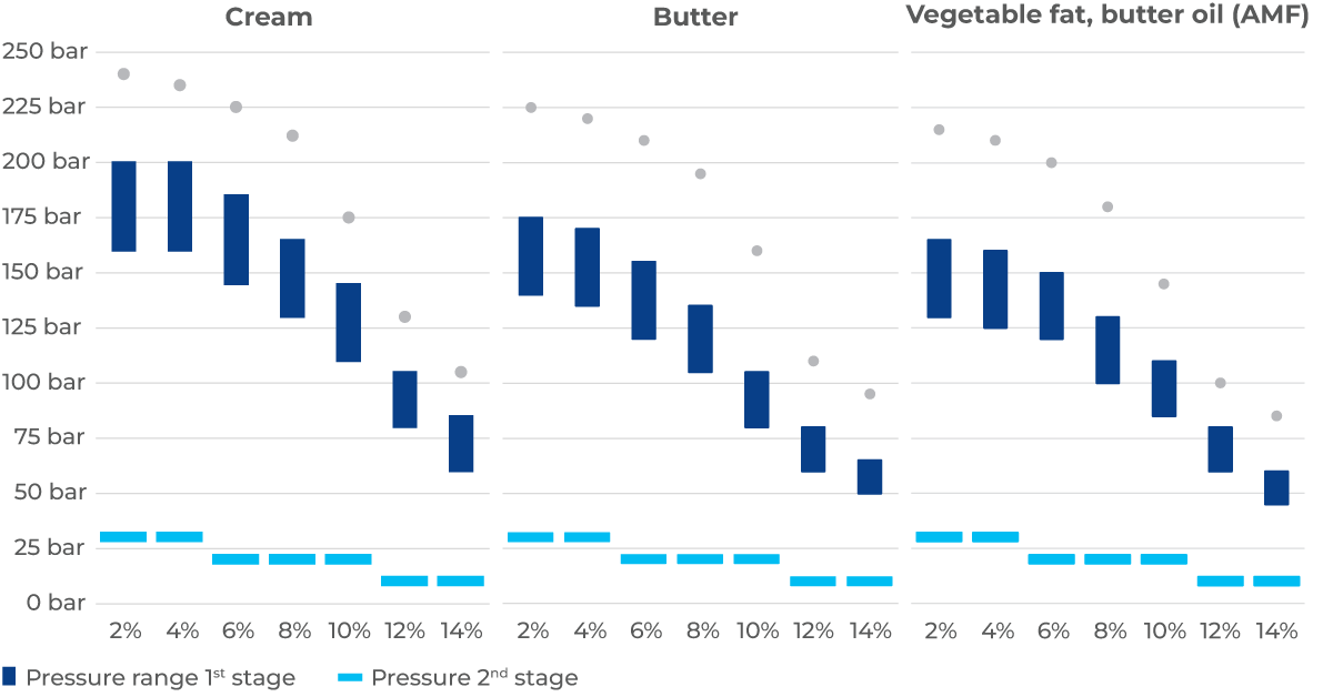 The graph illustrates the pressure range recommended for the first and second stages of homogenizing the mix when using an HD100 homogenization device using three different fat types, i.e. cream, butter and vegetable fat/butter oil. The pressure is indicated for 7 different fat levels in the mix, from 2 – 14% fat.