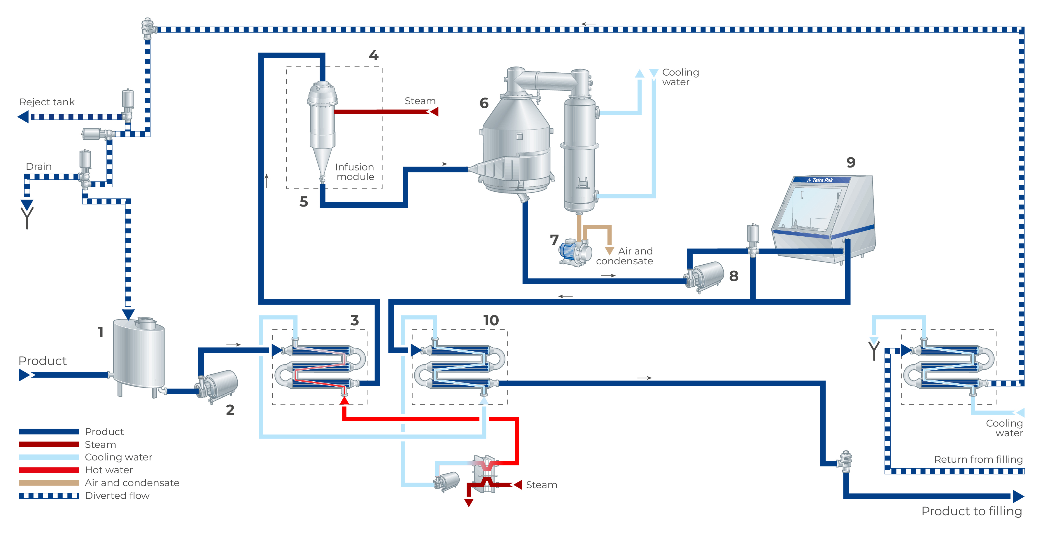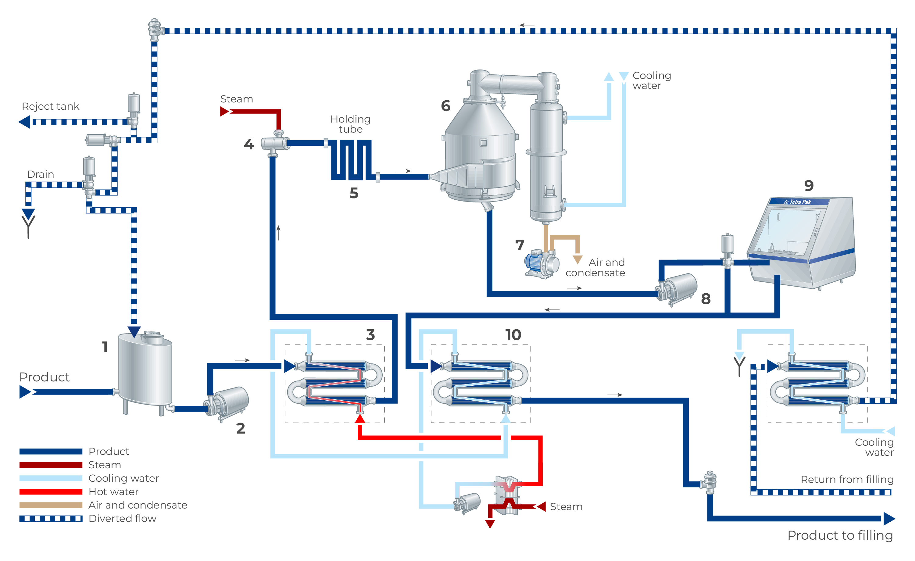 After homogenization, the product is cooled to approximately 20 °C in the tube heat exchanger (10) and then continues directly to an aseptic filling machine or to an aseptic tank for intermediate storage before being packed. If the sterilisation temperature drops during production, the product is diverted into a reject tank and the plant is flushed by water. The plant must be cleaned and sterilised before restart.