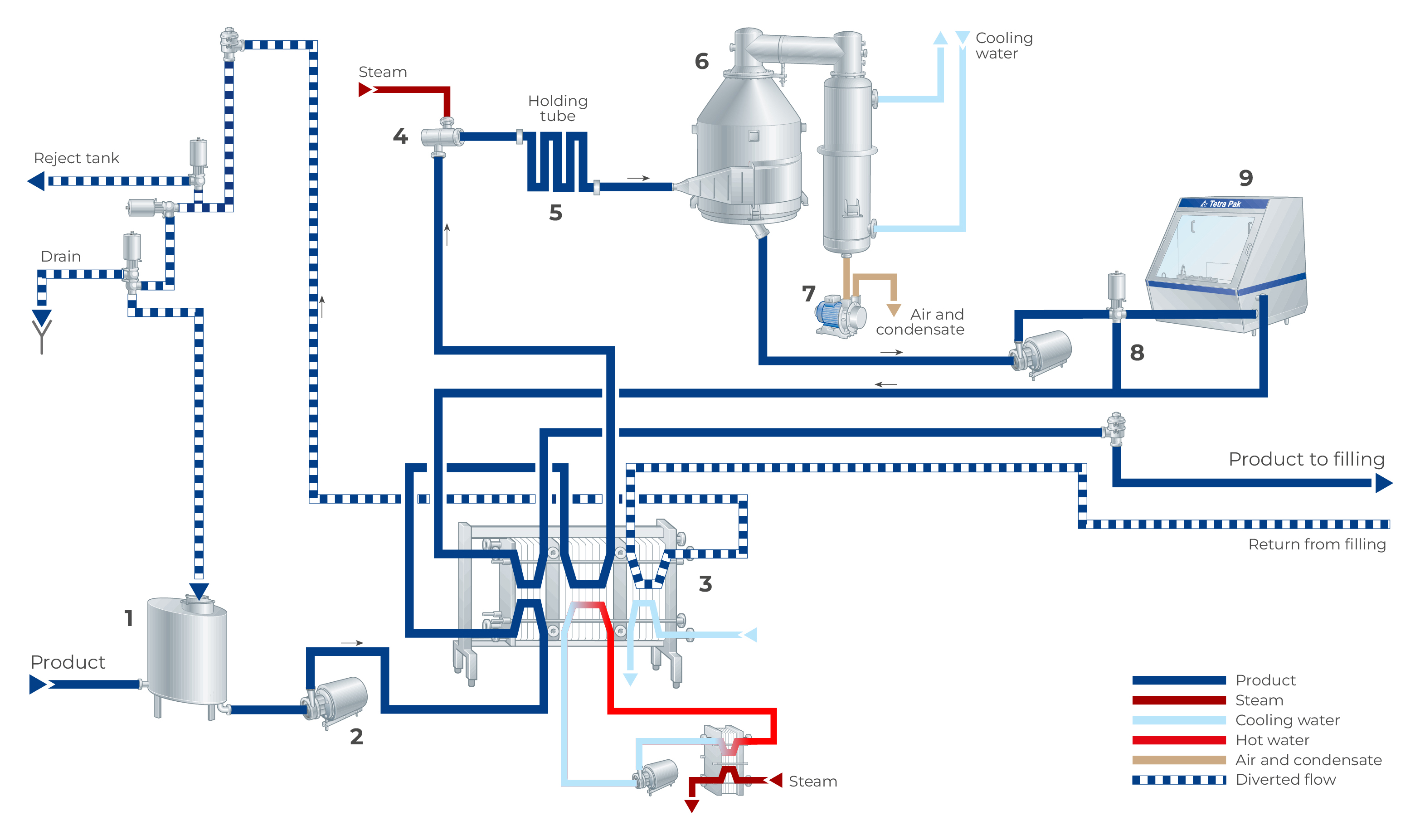 In the flowchart in Figure 10.14, the product at about 4 °C is supplied from the balance tank (1) and forwarded by the feed pump (2) to the pre-heating section of the tubular heat exchanger (3). After pre-heating to approximately 80 °C, the product then continues to the ring nozzle steam injector (4). The steam injected into the product instantly condensates to water and raises the product temperature to about 140 – 150 °C (the pressure prevents the product from boiling). The product is held at UHT temperature in the holding tube (5) for a few seconds before it is flash-cooled. Flash cooling takes place in the vacuum vessel (6) where the temperature instantly drops to pre-heating temperature due to the partial vacuum which is maintained by a pump (7). The vacuum is controlled so the amount of water vapour flashed off from the product equals the amount of steam previously injected. A centrifugal pump (8) feeds the UHT-treated product to the aseptic two-stage homogenizer (9).