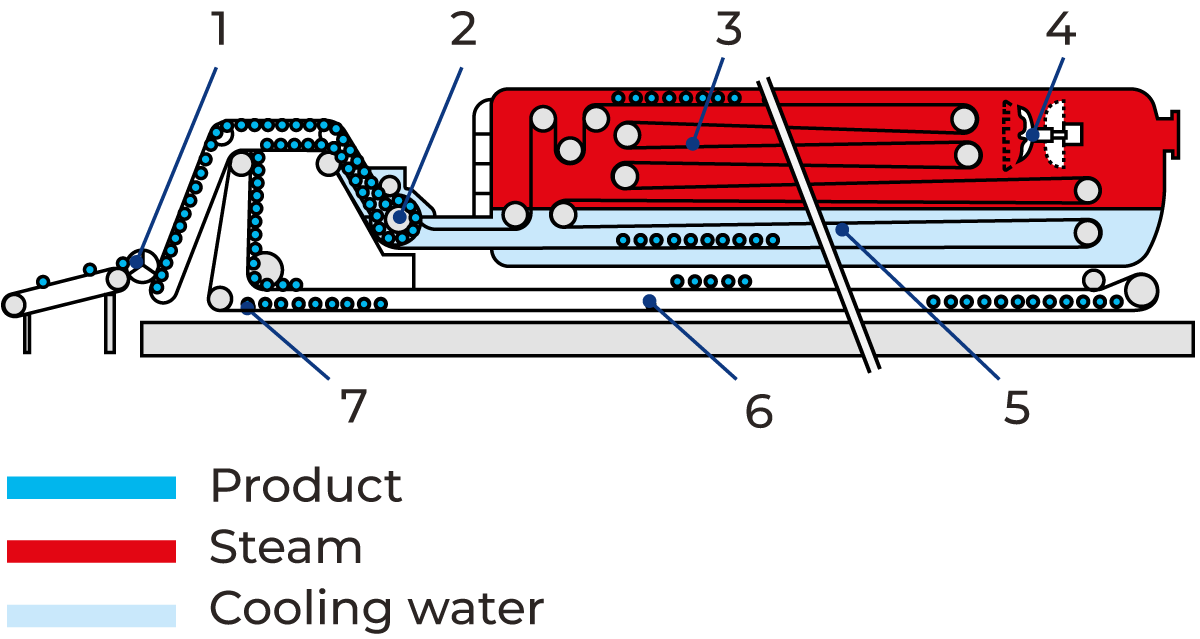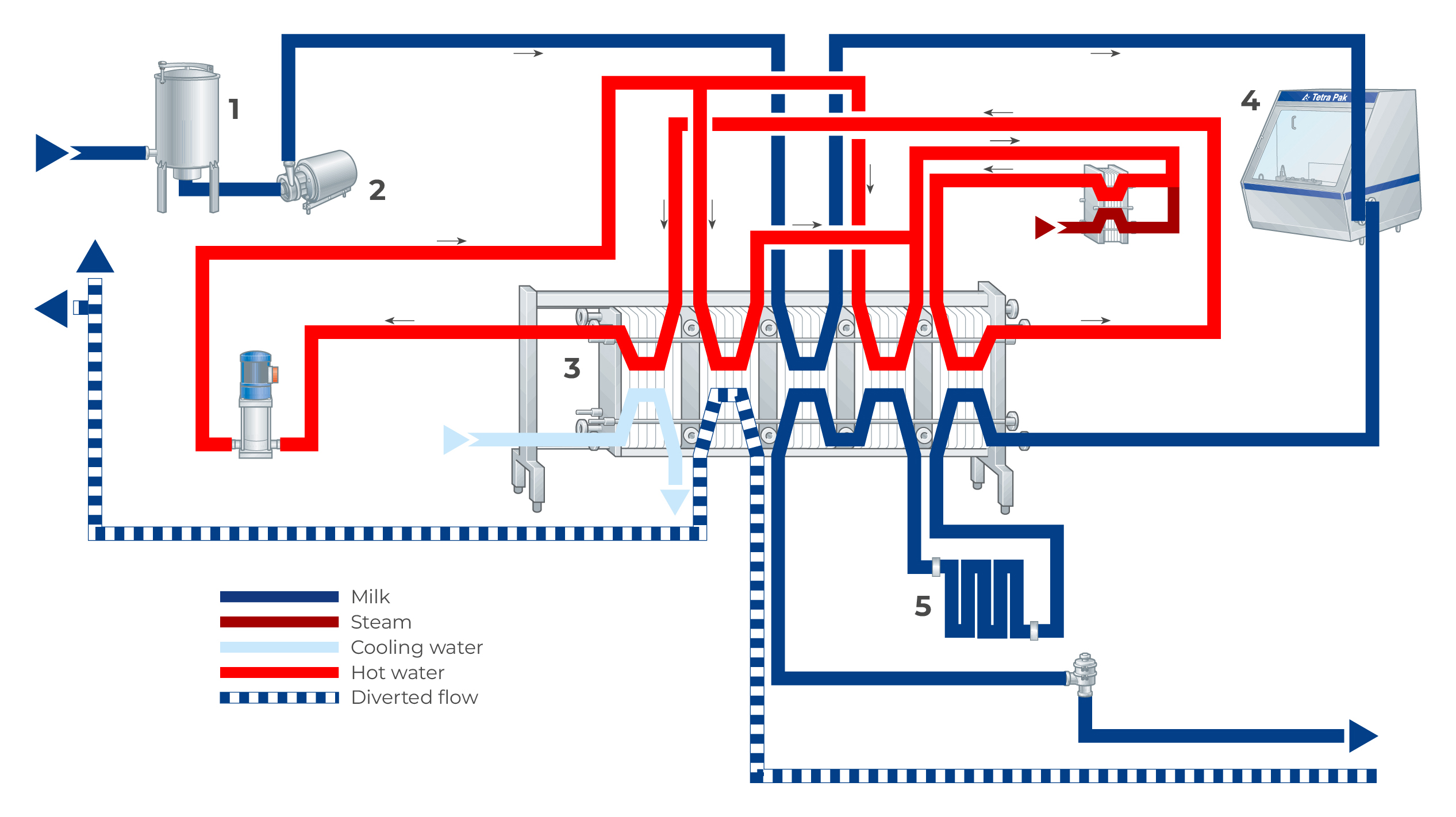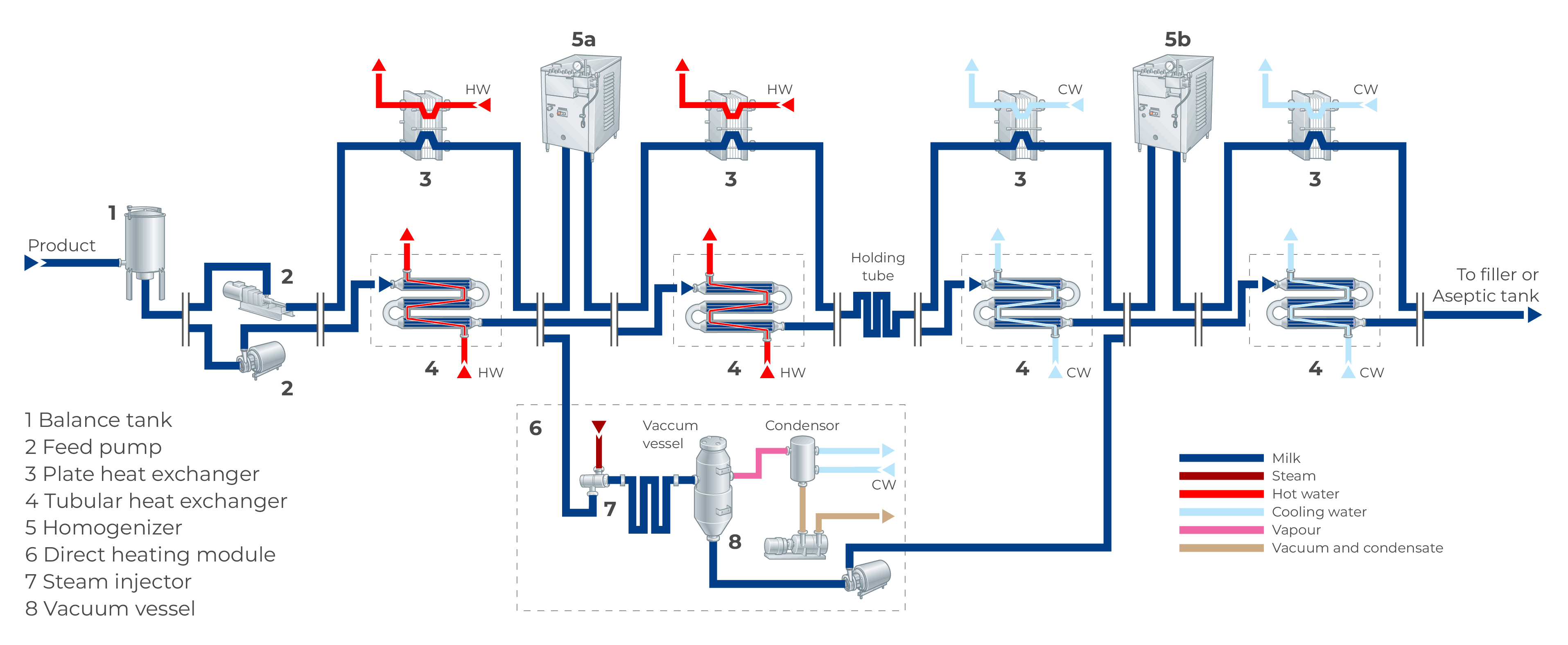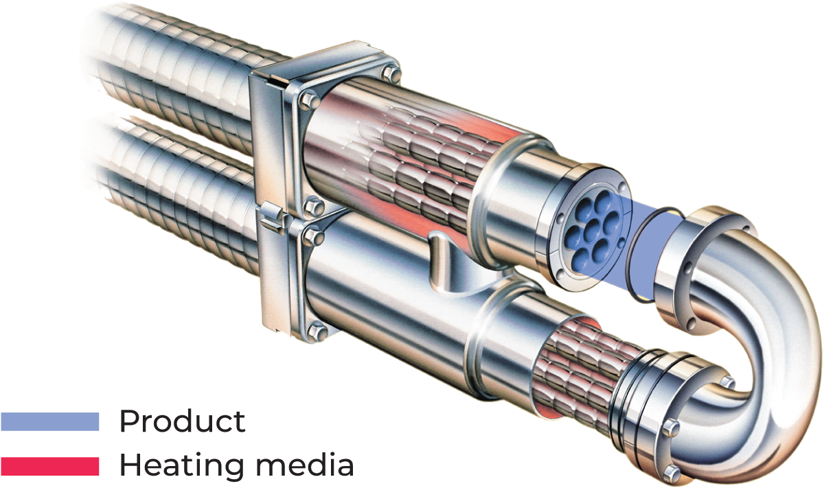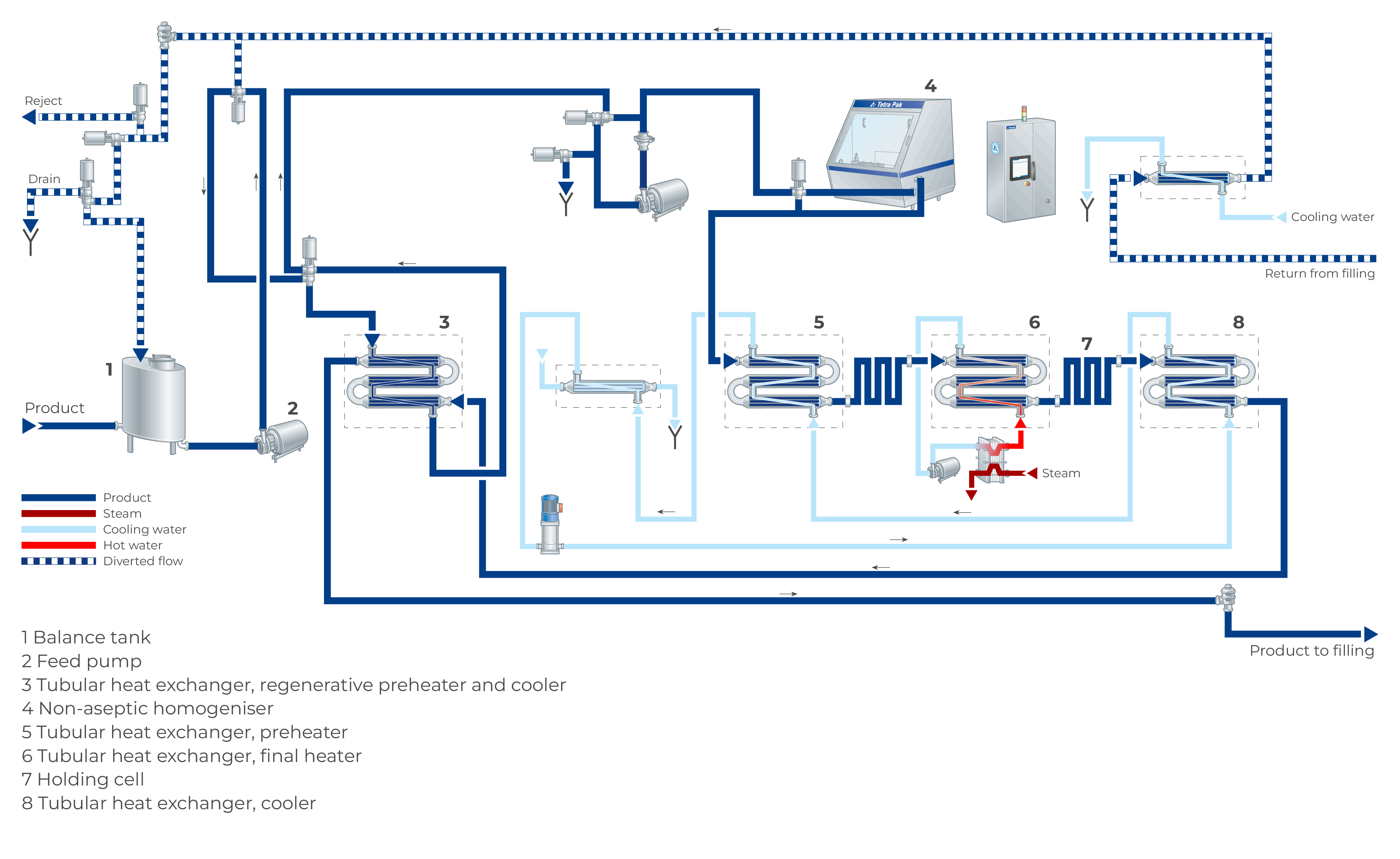 The pre-heated, homogenized product continues to the second preheating section (5) and to final heating section (6) of the tubular heat exchanger, where it is heated to about 138 °C. Heating is performed by hot water in a closed water circuit. After heating, the product passes through the holding tube (7), dimensioned for about 4 seconds.