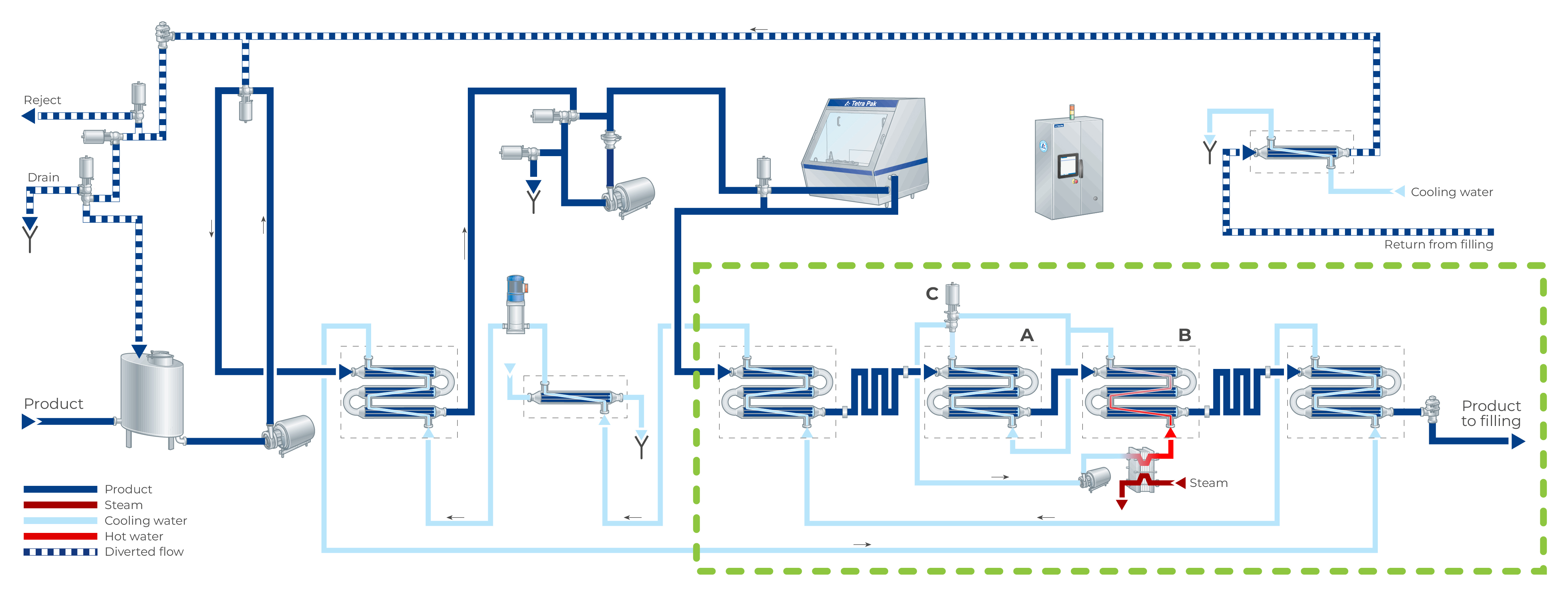 If the temperature drops during production, the product is diverted into a reject tank and the plant is flushed with water. The plant must be cleaned and sterilised before restart.